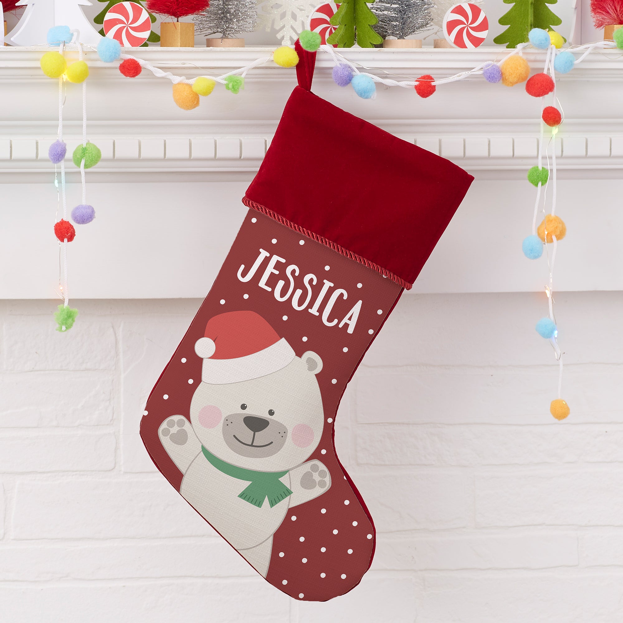 Make a dramatic and warm addition to your holiday home this year and every year with our Holly Jolly Characters Personalized Polar Bear Christmas Stockings.