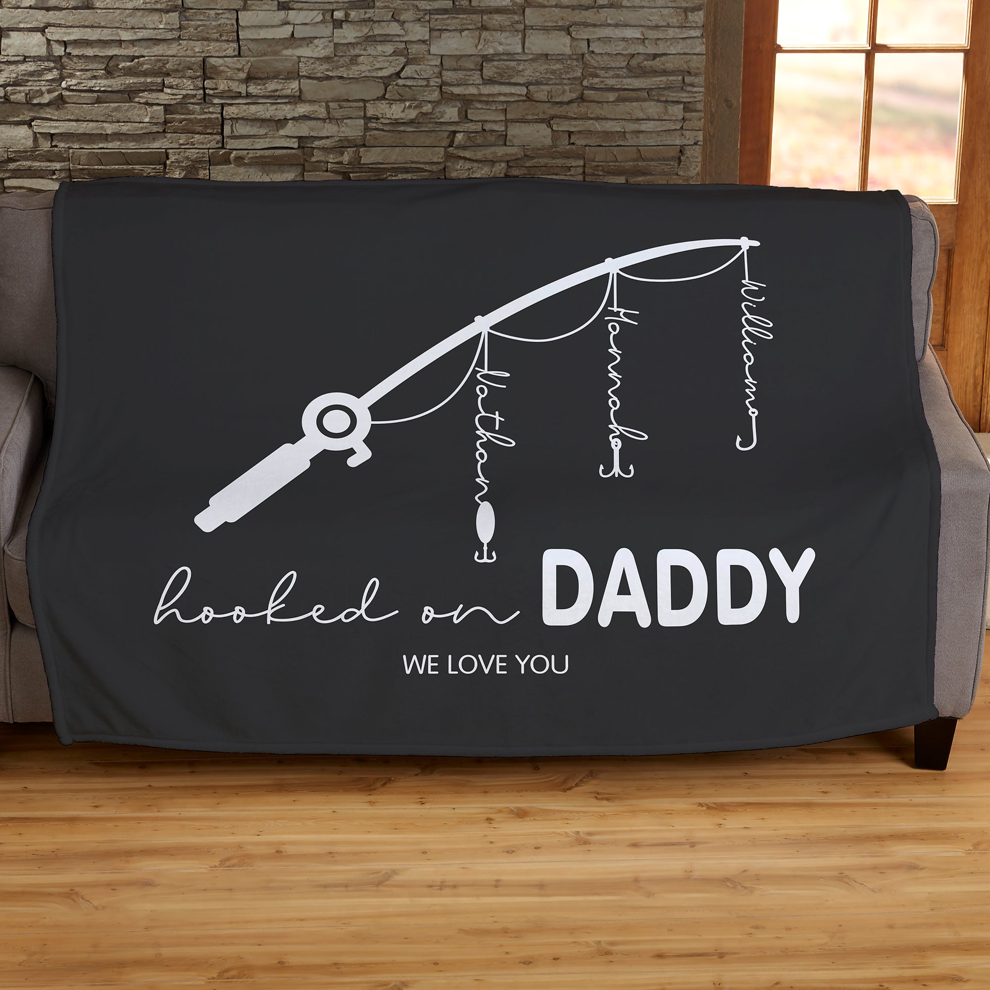 They will relax in comfort with our Hooked On Dad Personalized Blanket. This blanket is ideal for outdoor sporting and leisure events year round, watching their favorite TV show, or for snuggling indoors with a good book.