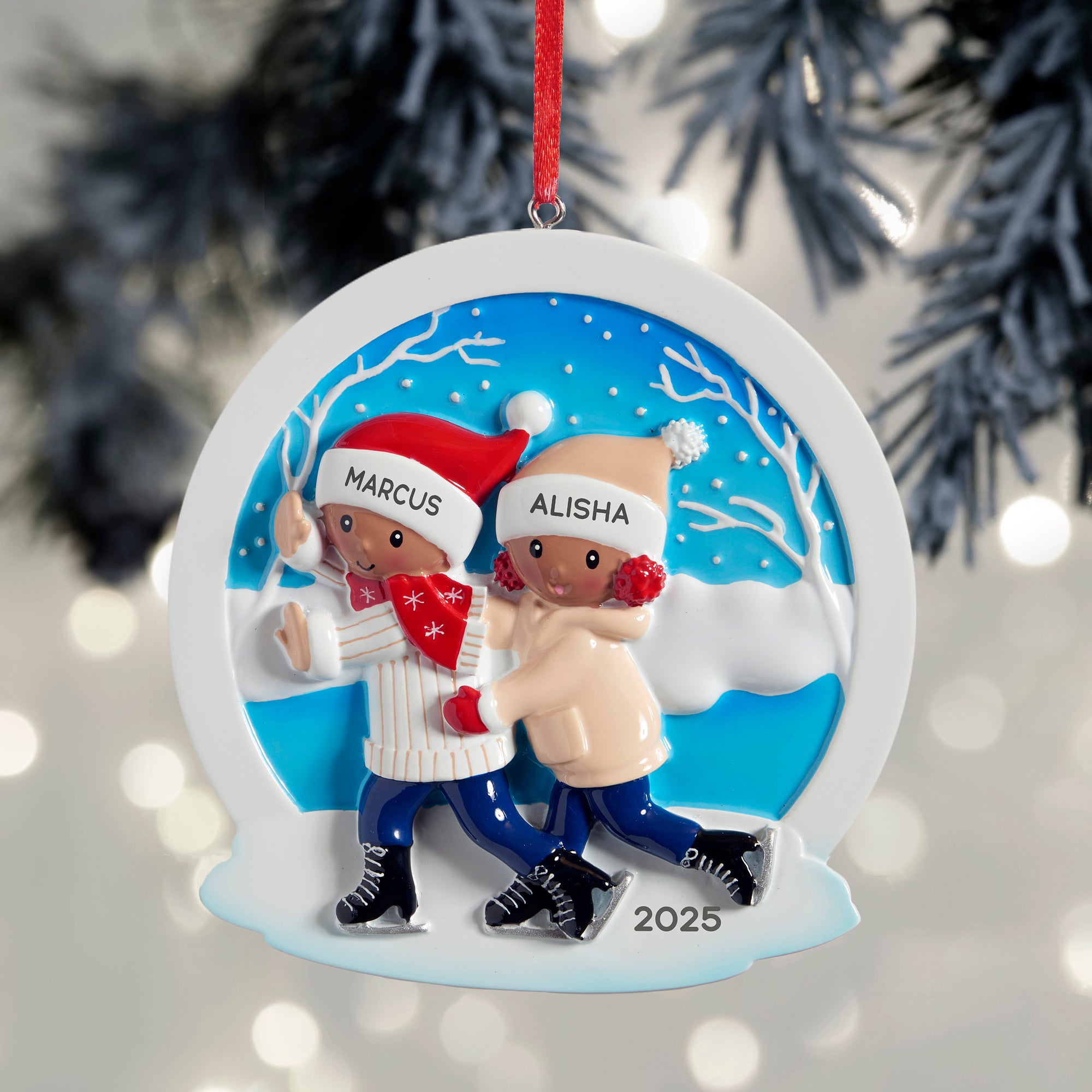 Create a whimsical holiday memory for the happy couple with the Ice Skating Personalized Couples Ornament.