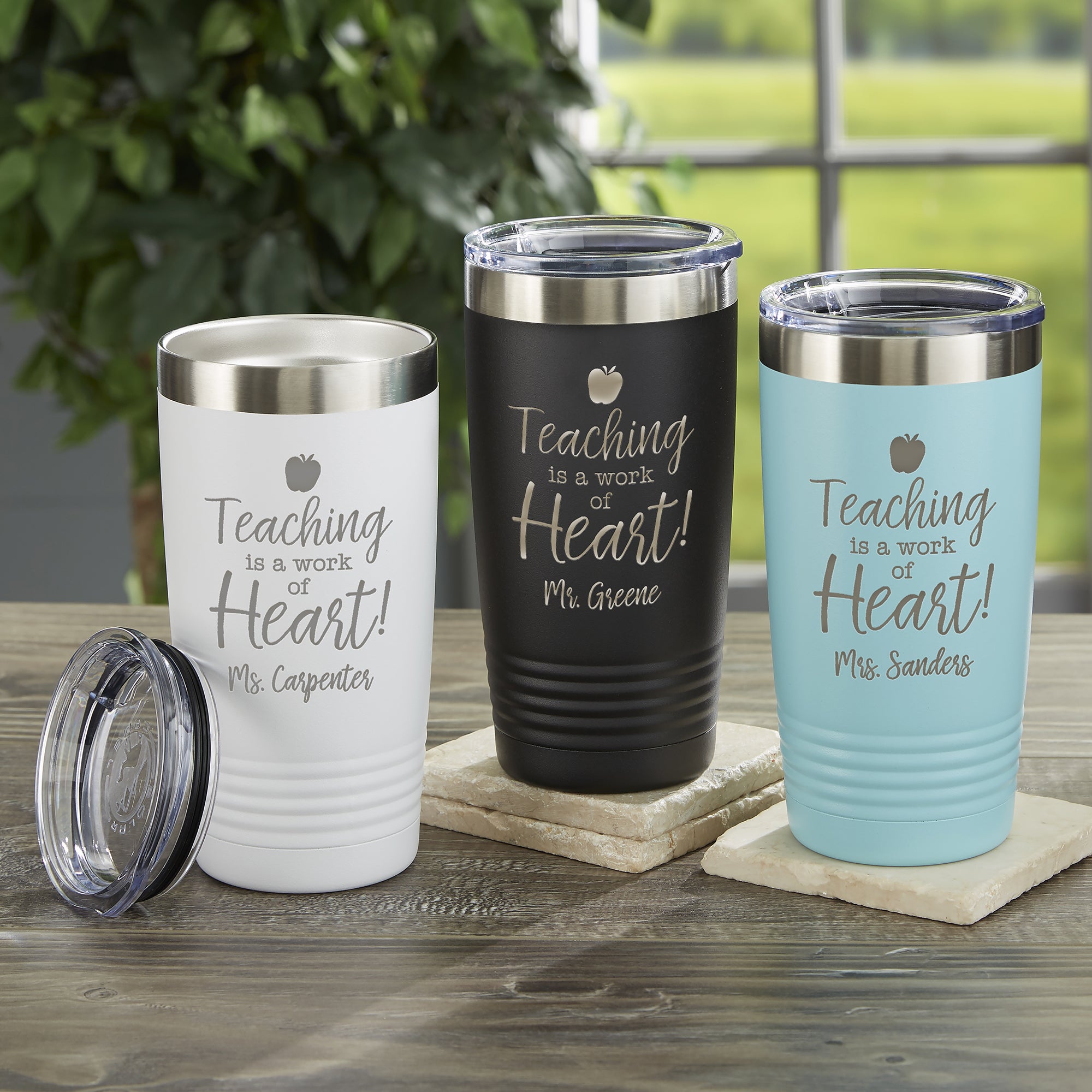 Our Inspiring Teacher Personalized 20 oz. Vacuum Insulated Stainless Steel Tumblers are great to use in the classroom or at home. Featuring the phrase, "Teaching is a Work of Heart", this is the perfect gift for any teacher!