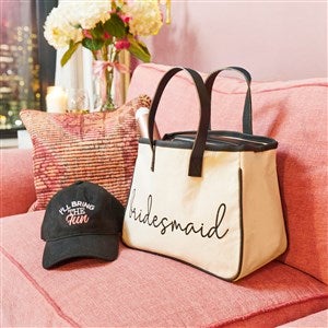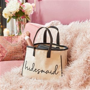 Give her a tote she'll love before, during, and after the wedding! We love using this bag to "wrap" gifts for the bridal shower or bachelorette party! The tote's comfortable leather straps easily fit over the shoulder for a travel, beach, or gym bag. This item comes pre-personalized- so no extra thinking is required, it's cute as-is!