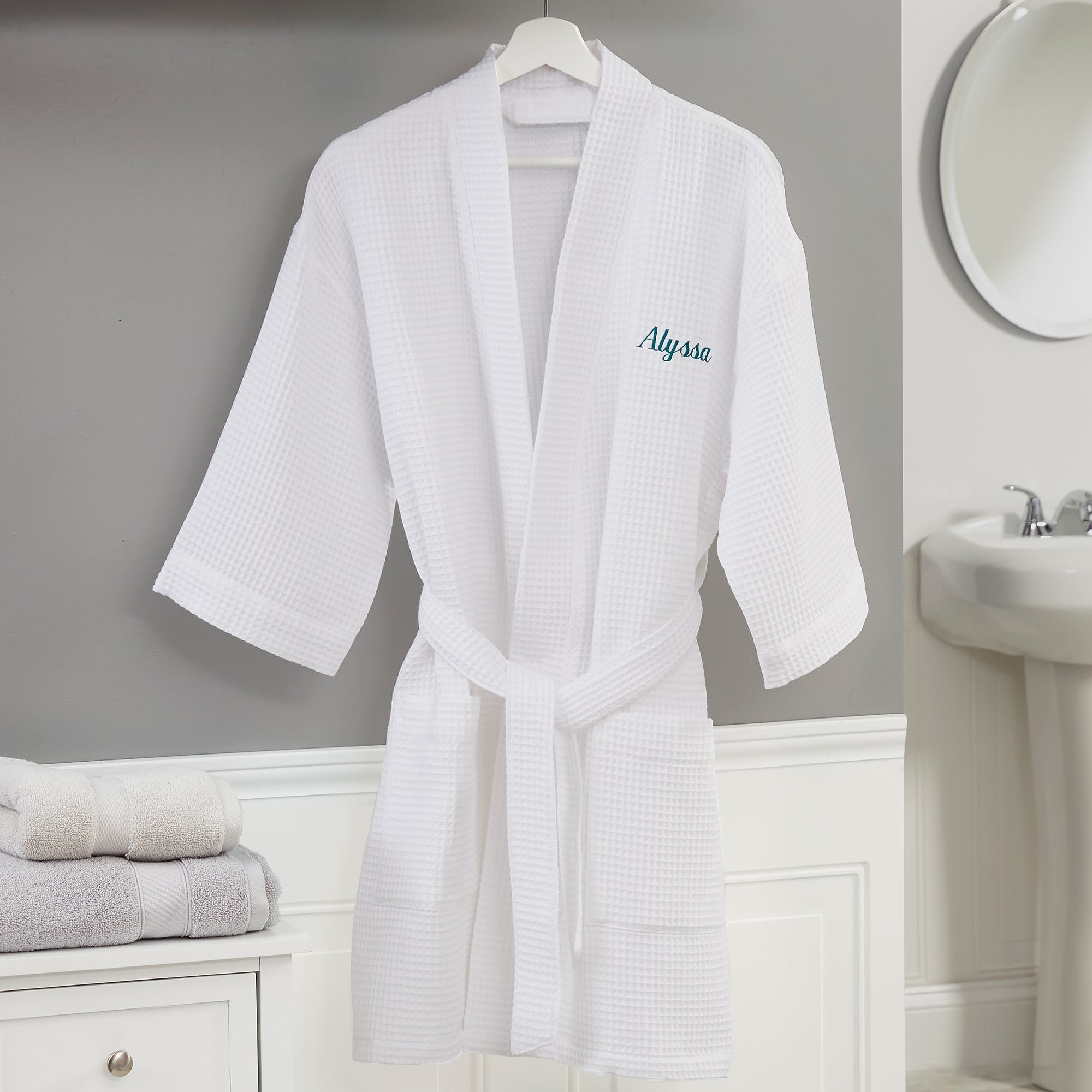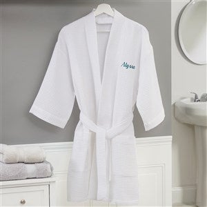 Step out of the bath or shower in signature style with a custom Embroidered Waffle Weave Kimono Robe. Fashionable kimono style robe features stylish waffle-weave texture ready for you to sink into for a comfy, cozy morning or night. Embroider with any name, initial or monogram. Makes a great shower gift for the bride to be, high school graduates going off to college, birthdays and so much more!