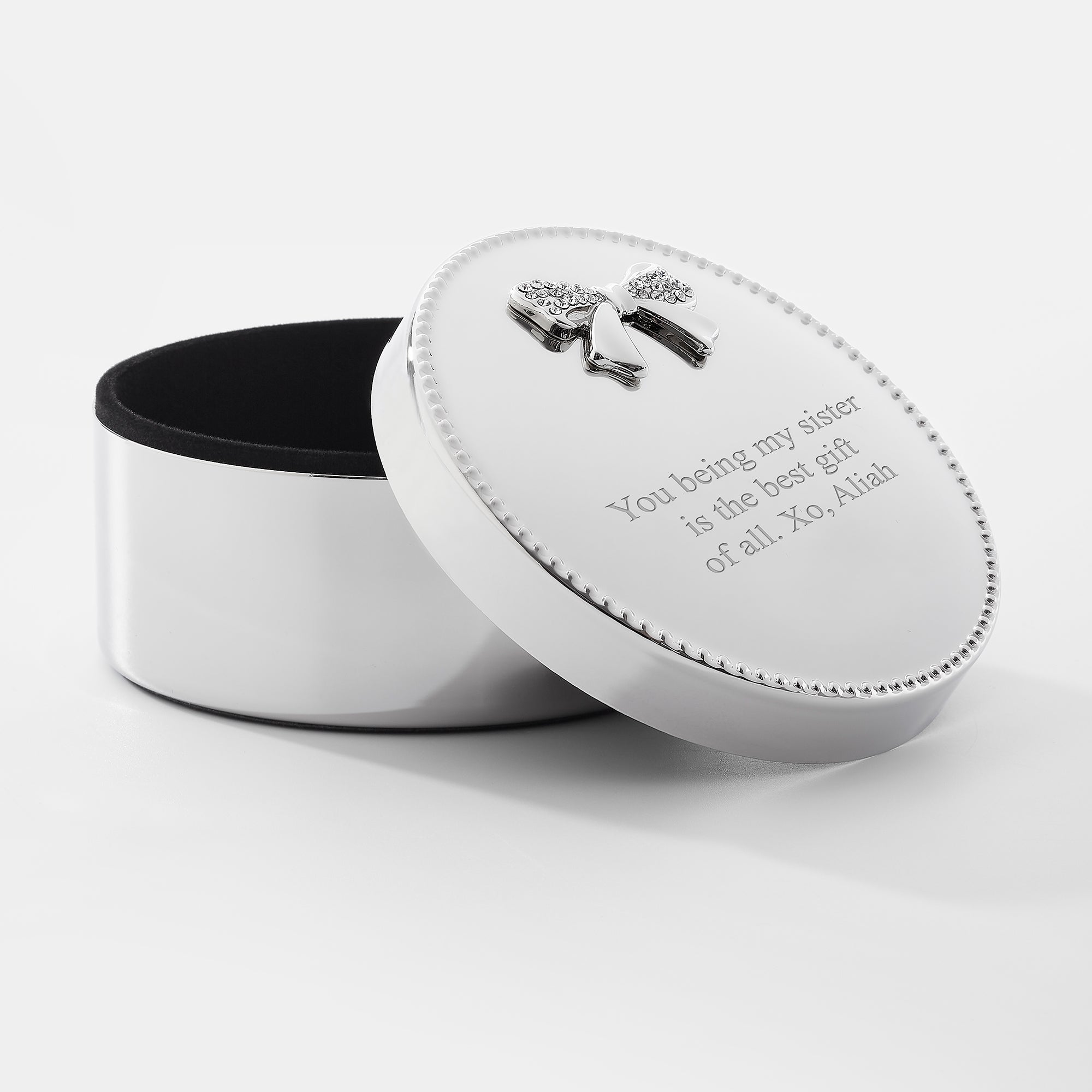 - Round jewelry and keepsake box with beaded detail edge and raised crystal bow on the lid