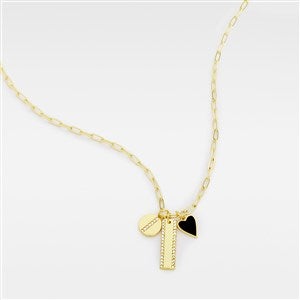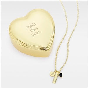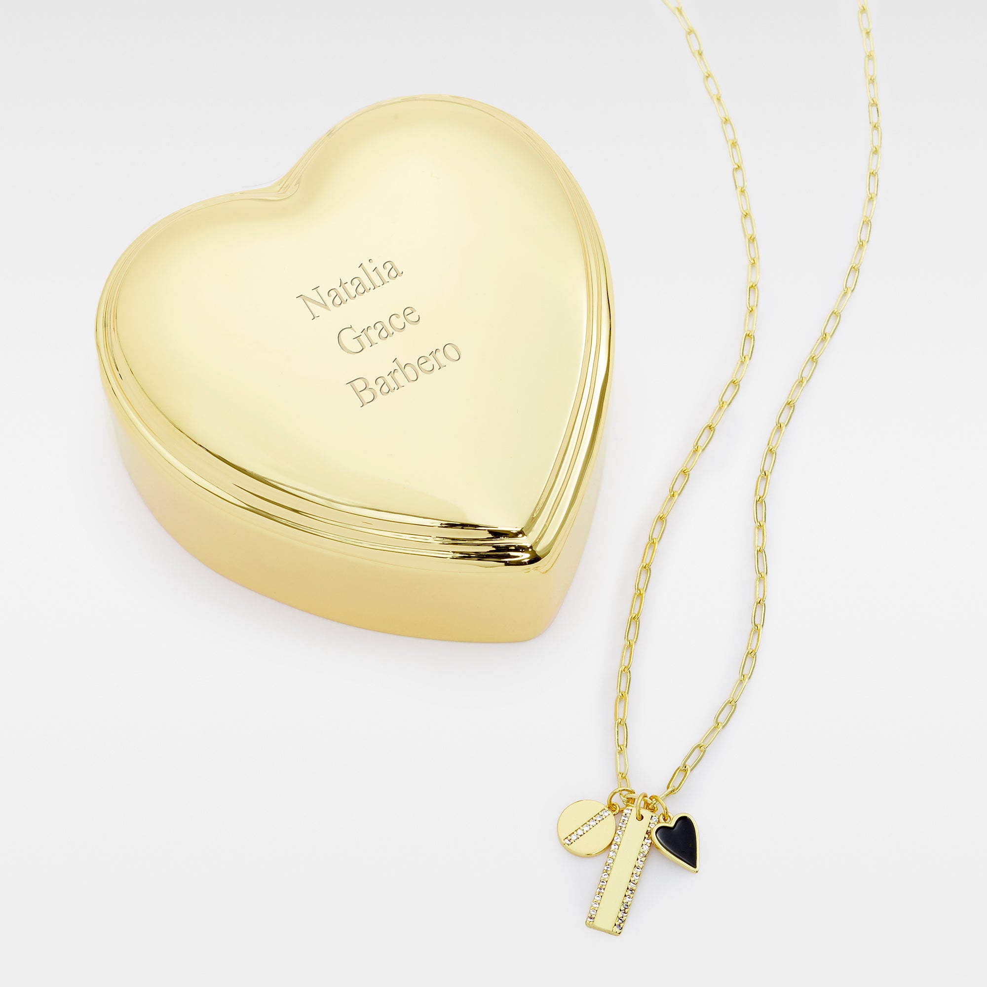 This exclusive set of our velvet-lined Golden Heart Keepsake Box with gold plated Multi Charm Necklace makes a wonderful gift for any jewelry lover. The necklace is gold plated with tiny heart, disc, and bar pendants. The box provides a beautiful and safe place for her to store her favorite pieces of jewelry.  Engrave the lid with her initials, name, or a sweet personal note! Makes a great gift for Christmas, birthdays, or just because!