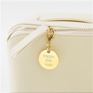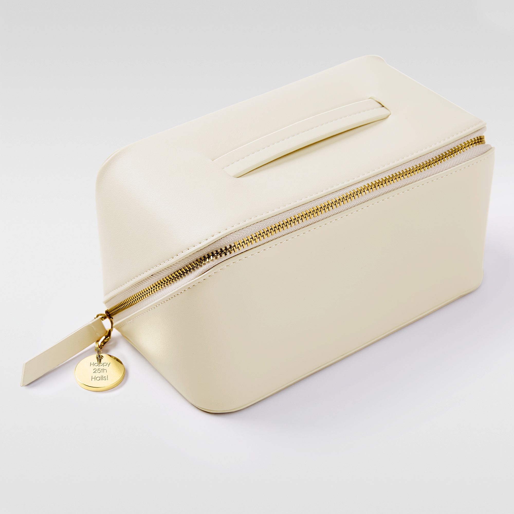 Our Engraved Large Cream Leather Beauty Case will be a lifesaver for your loved ones that love to be on-the-go! Great for skincare, cosmetics, or any kind of small accessories. It comes with a removable charm that we will engrave with their initials, name, a special date, or a short sentimental message. This makes a wonderful gift for Mother's Day, birthdays, bridal showers, and more! We also offer this beauty case in black and blush, and also in a smaller size.