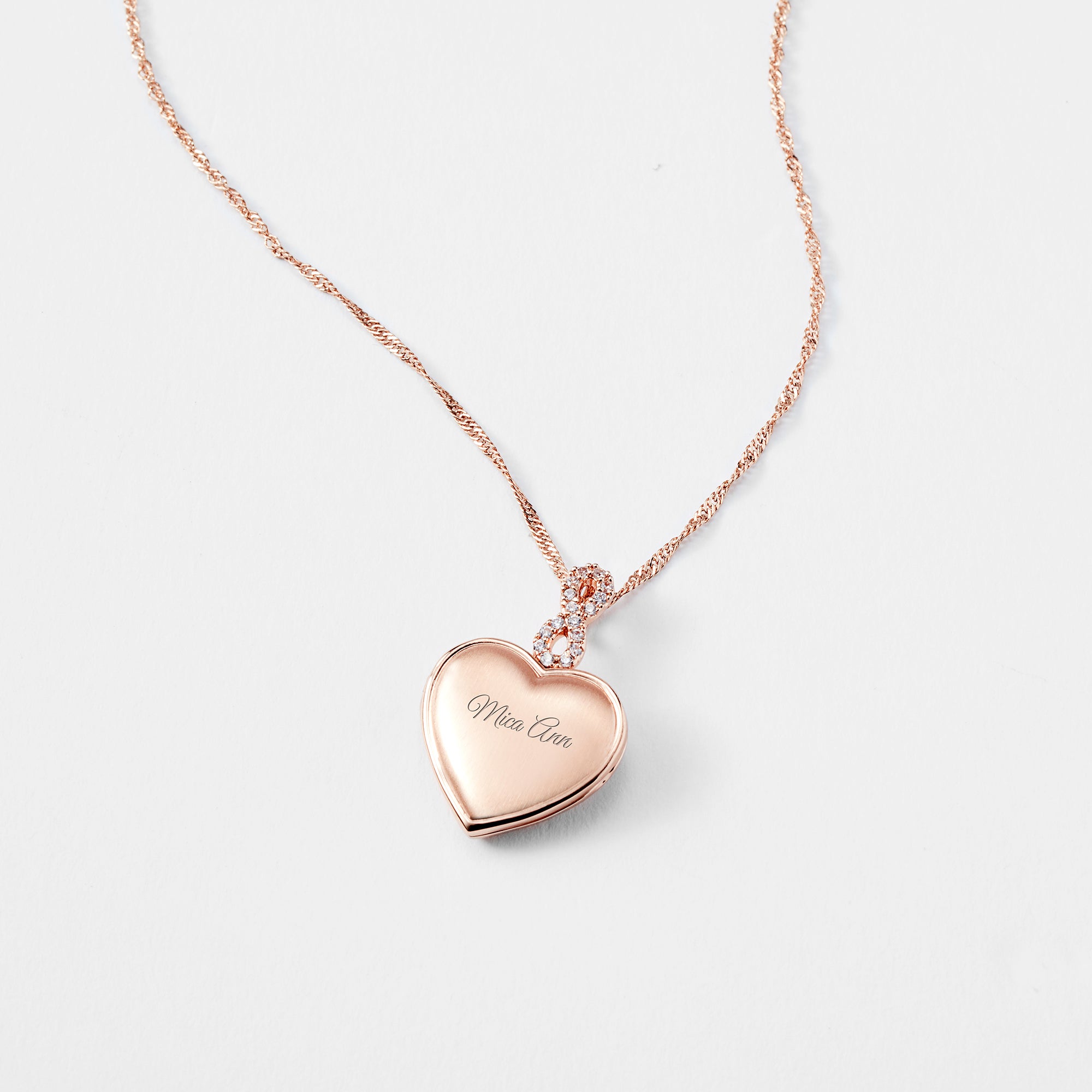 - Rose gold heart locket with a jeweled infinity sign along the bail