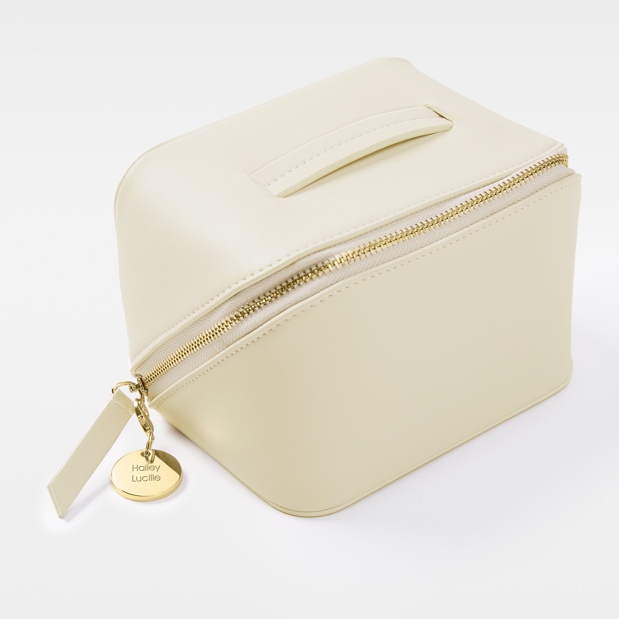 - Small cream leather beauty case with gold zipper closure