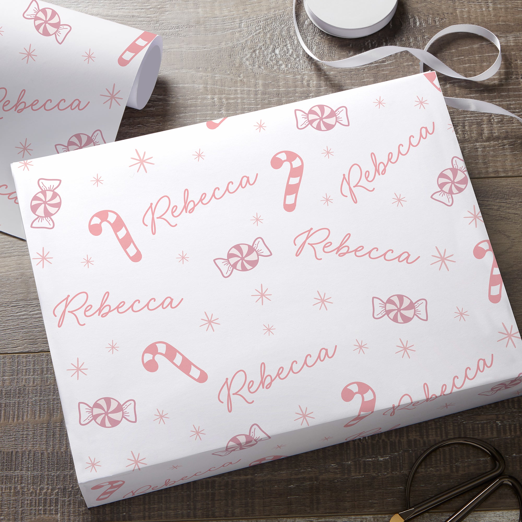 Kittenish Pink Peppermints Personalized Wrapping Paper in White