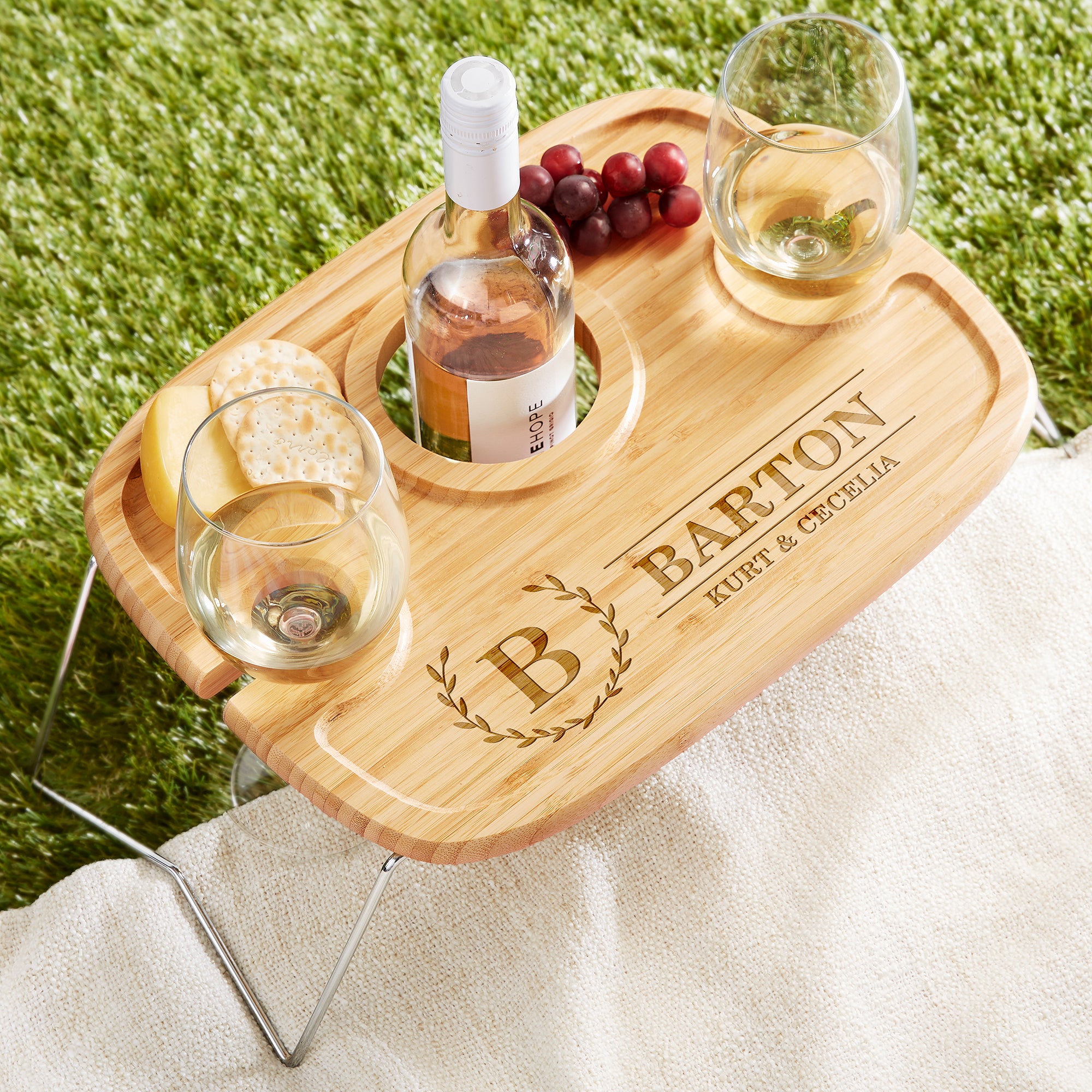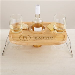 Enjoy the outdoors and a glass of wine at the same time without compromising your comfort. Our Laurel Initial Personalized Wine Picnic Tray is the perfect companion for any open air occasion, whether you're savoring the weather in your own backyard or taking in the sights at your local park.