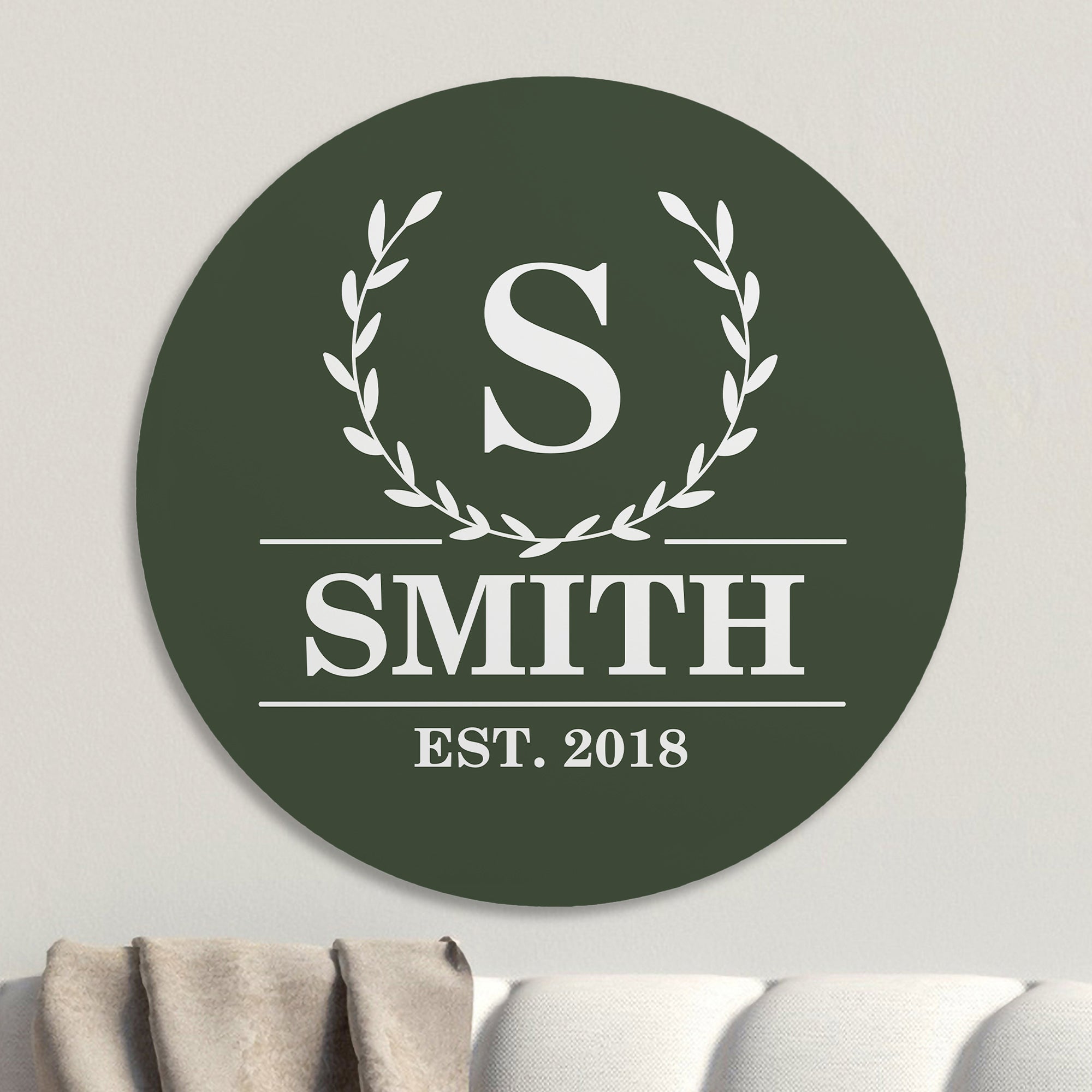 Laurel Wreath Monogram Personalized Round Wood Sign