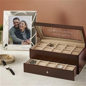 This picture frame from the trusted brand Lenox is even more beautiful with your engraved message. From their "Adorn" collection, the design features swirled ribbon detail sculpted into silver metal. We'll add your personal message below the photo; we suggest their names, wedding or anniversary date, or a heart-felt note. They'll love to see their favorite wedding or family photos on display with such love and care.