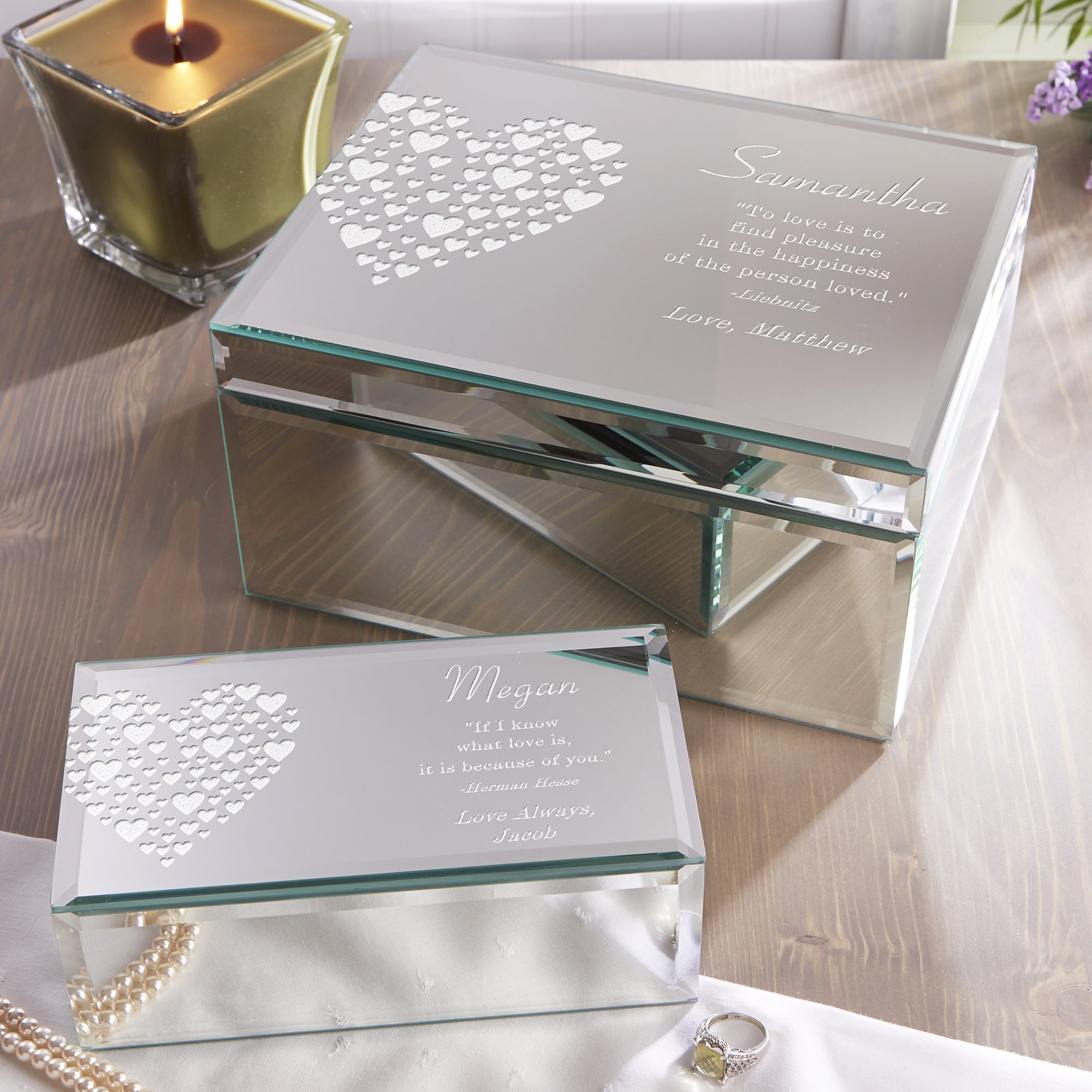 Give her a meaningful keepsake she will treasure each and every day by personalizing our stunning Love Is Kind Engraved Mirrored Jewelry Box.