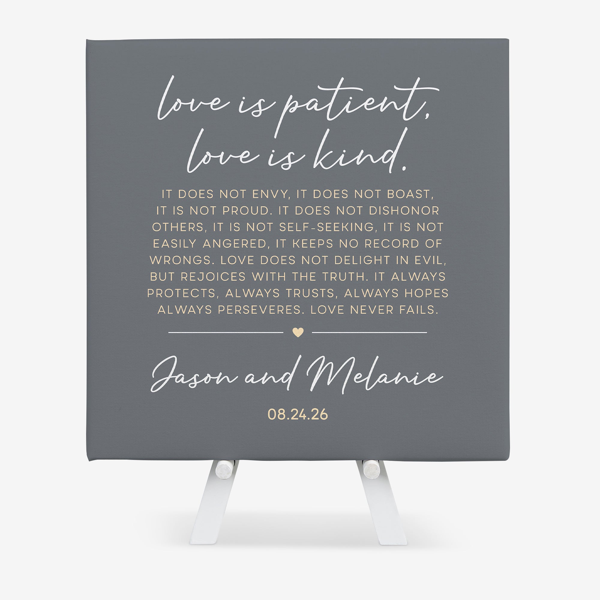 Our Love is Patient Personalized Wedding Canvas Print is rich in symbolism with the timeless and memorable words of 1 Corinthians, Chapter 13.