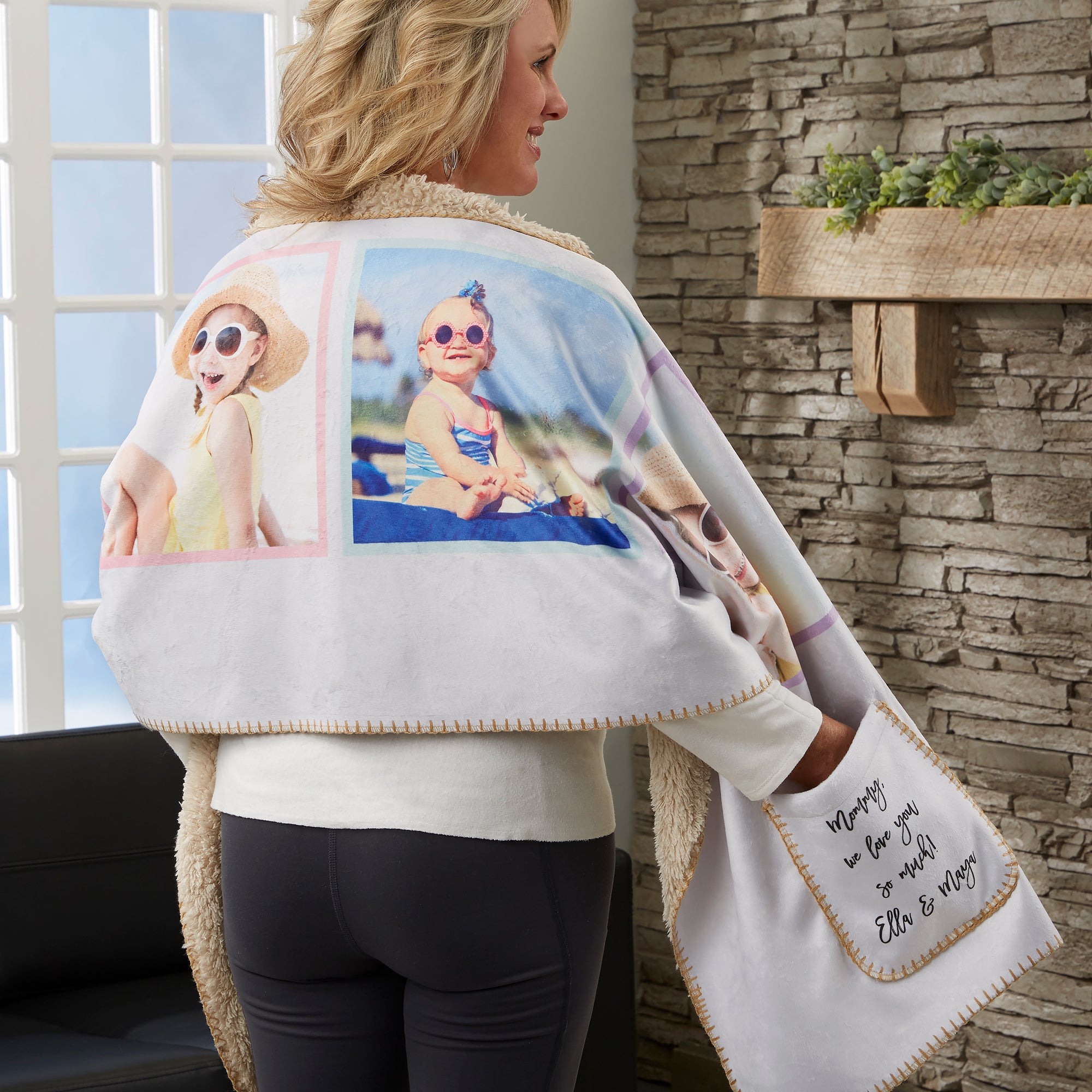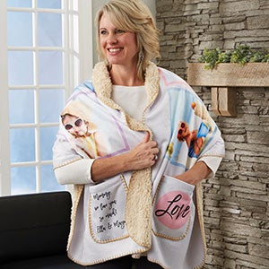 Let her keep herself warm and cozy while relaxing, watching TV or working at her desk with our Love Photo Collage Personalized Cuddle Wrap. The design features photos of the ones she loves dearly creating the perfect shoulder blanket for the family room, office and more.