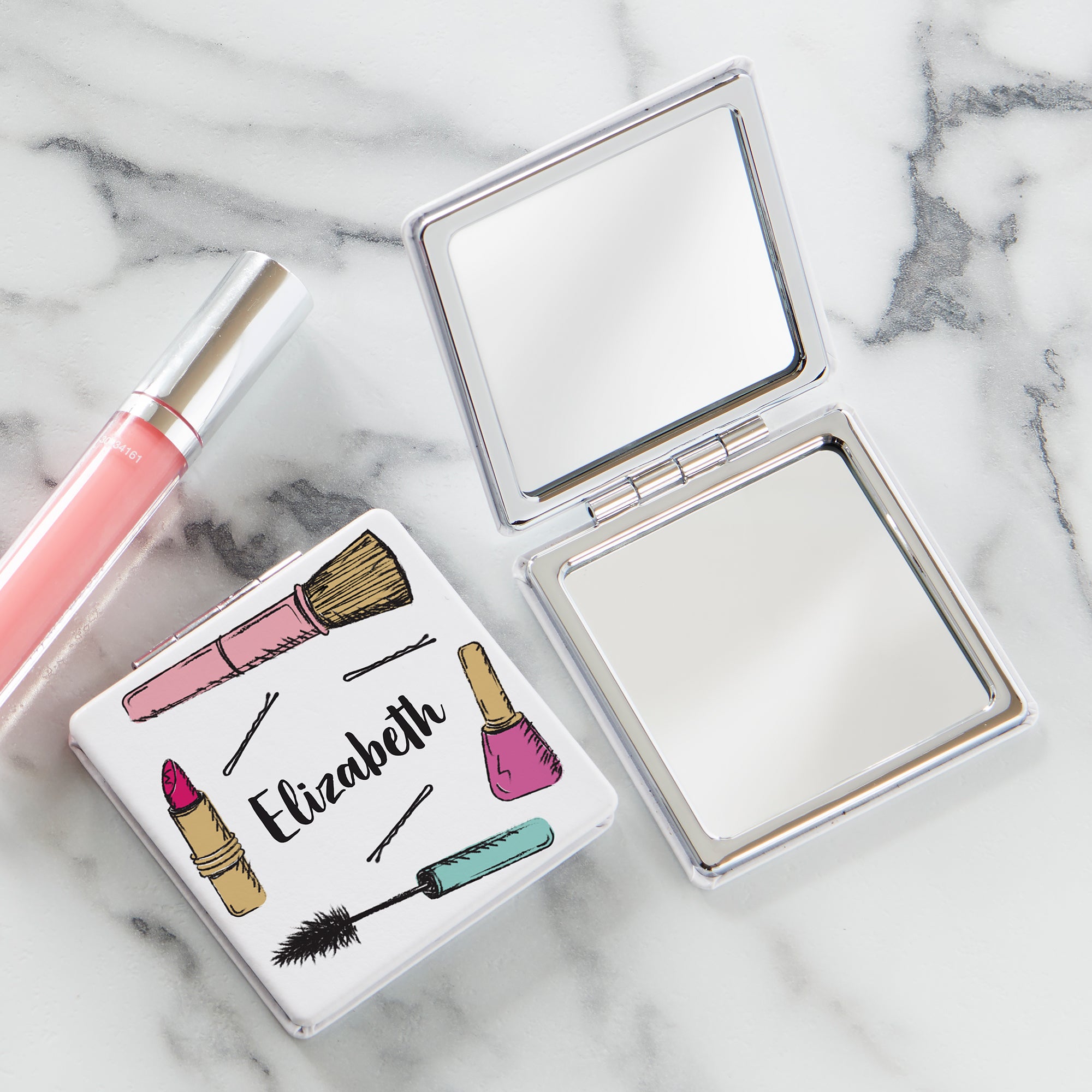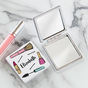 Our Makeup Brushes Personalized Compact Mirror will be a true reflection of her beauty. This essential accessory was designed for women on the go. Perfectly sized to slip into her purse or pocket, she will use it often to touch up her make-up, hair and more. Makes a thoughtful gift for birthdays, bridesmaids and much more.