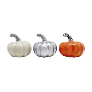 Swap out your regular napkin weight for this trio of pumpkin weights! Each is coated in enamel to color them cream, silver, and orange for the fall season.
