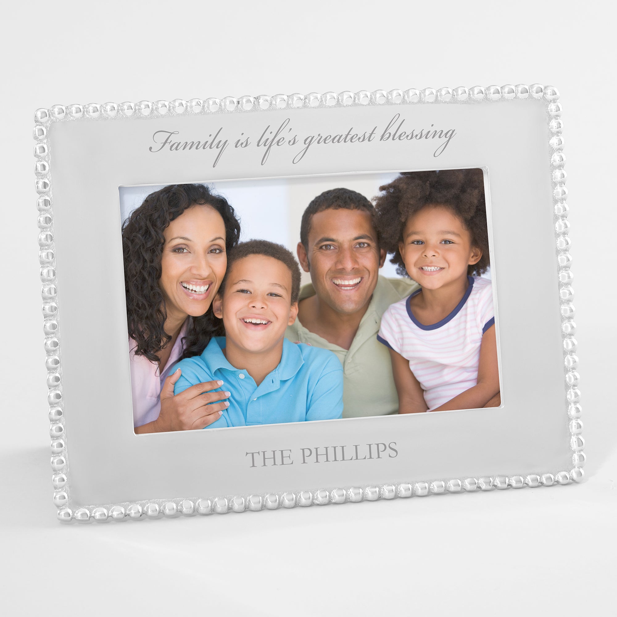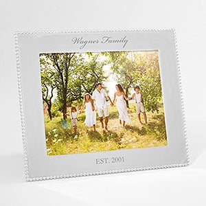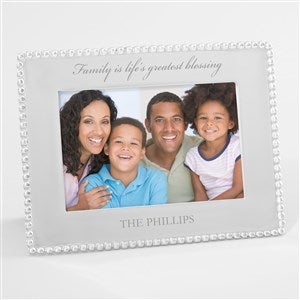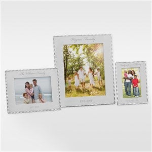The simplistically, classic design of our Mariposa® String of Pearls Engraved Family Photo Frame, is an elegant compliment to any photo. This stunning frame edged with a handcrafted string of pearls border, makes an exquisite gift.