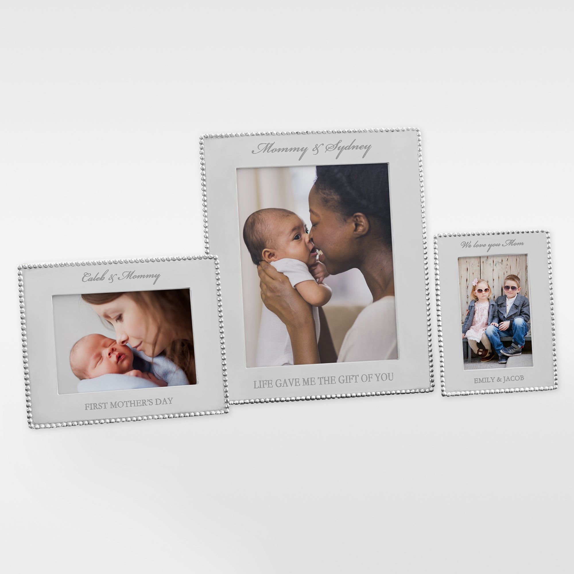 The simplistically, classic design of our Mariposa® String of Pearls Engraved Photo Frame for Mom, is an elegant compliment to any photo. This stunning frame edged with a handcrafted string of pearls border, makes an exquisite gift.