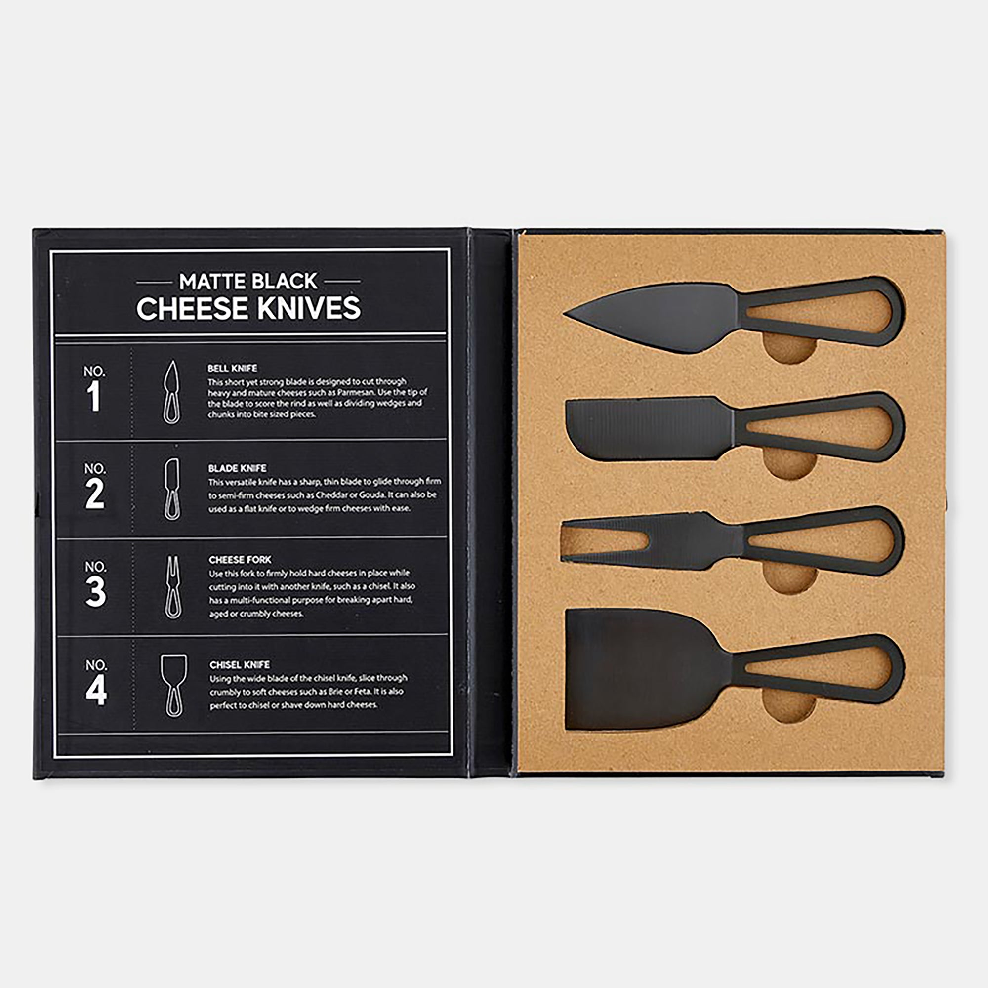 - Matte black cheese and charcuterie knife set of 4 in presentation gift box