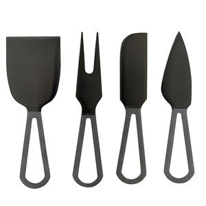 This Matte Black Cheese Knives Set come with all the tools needed for an expert charcuterie display. Beautiful matte black cheese knives set will help guests with any cheese selection. Set of 4 knives and spreaders of various shapes.