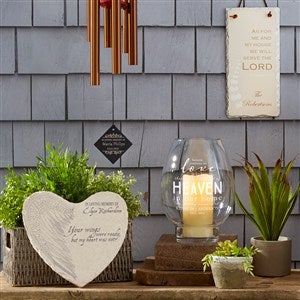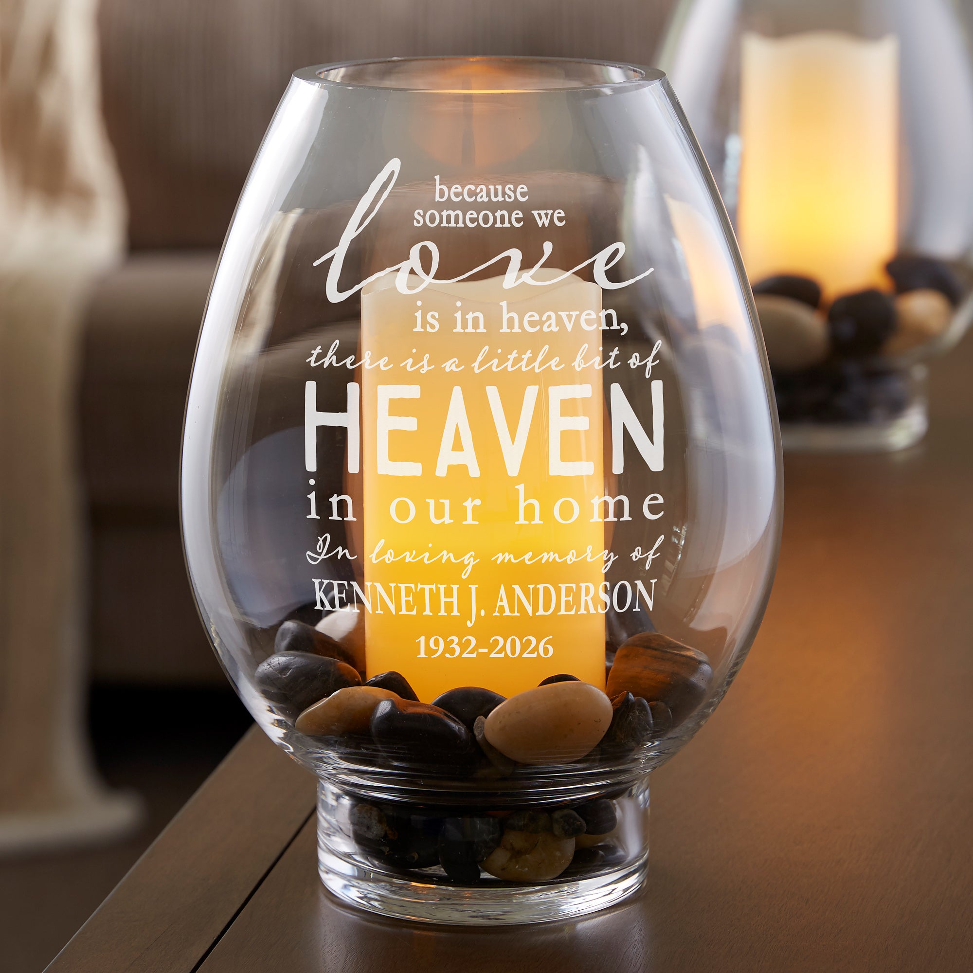 "Because someone we love is in heaven, there is a little bit of Heaven in our home." Keep their memory alive with our beautiful Heaven In Our Home Engraved Hurricane Candle Holder. Add a pillar candle (sold separately) or decorative fillers (not included) for a sentimental piece of home décor.