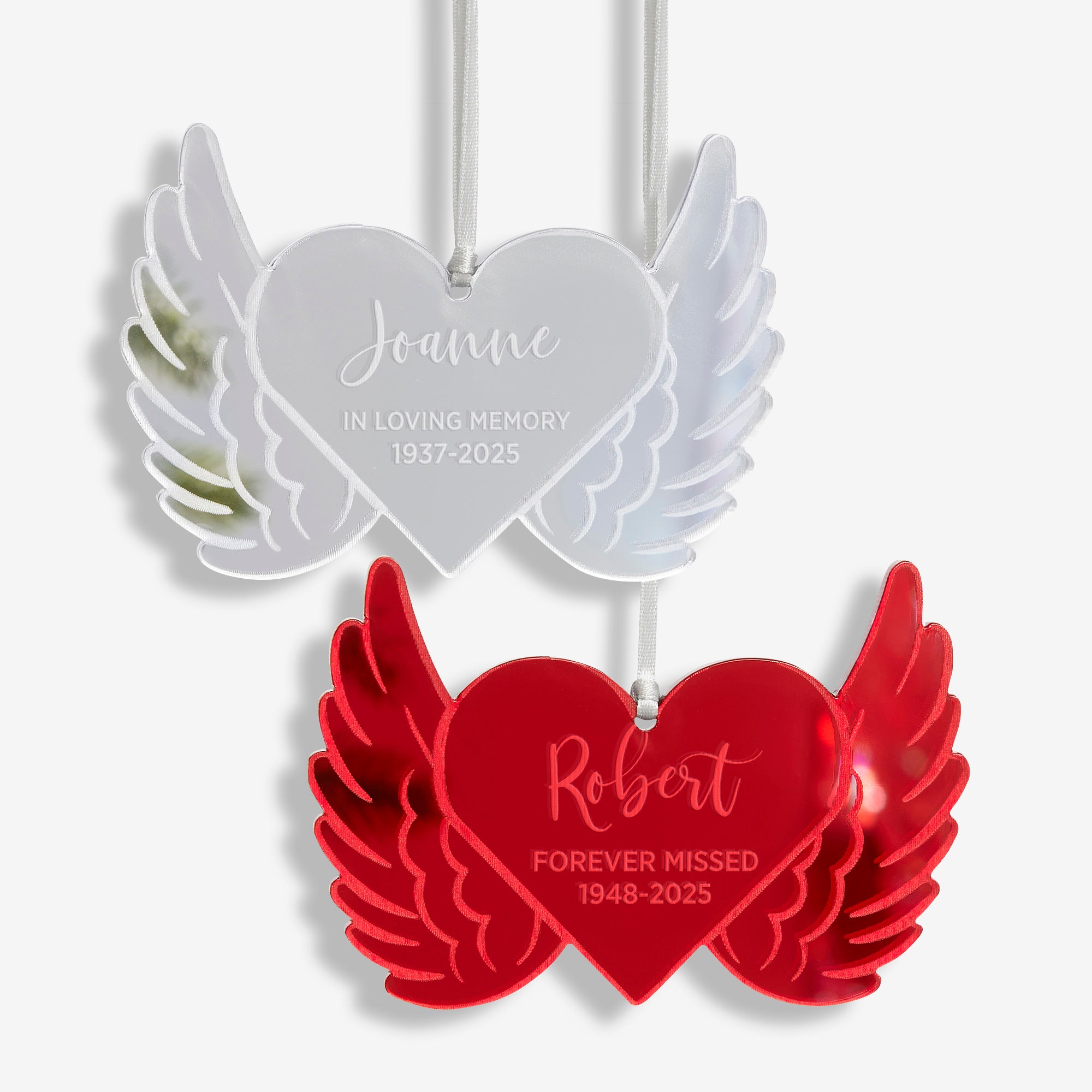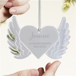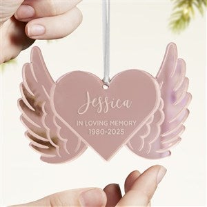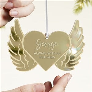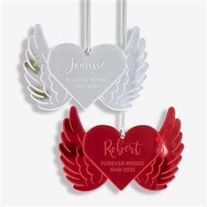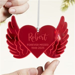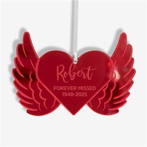 Celebrate their life with our Memorial Wings Personalized Acrylic Ornament. The heart wing is cutout of a mirrored acrylic creating a beautiful reflection to hang on any holiday tree.