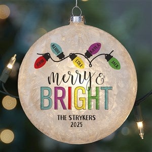 The Merry & Bright Lightable Frosted Glass Ornament is a unique way to display your family's names. Insert any small bulb Christmas tree light in the back and watch your ornament light up. Whether you use clear or multi-colored lights, your ornament will give a glow whenever your lights are on.