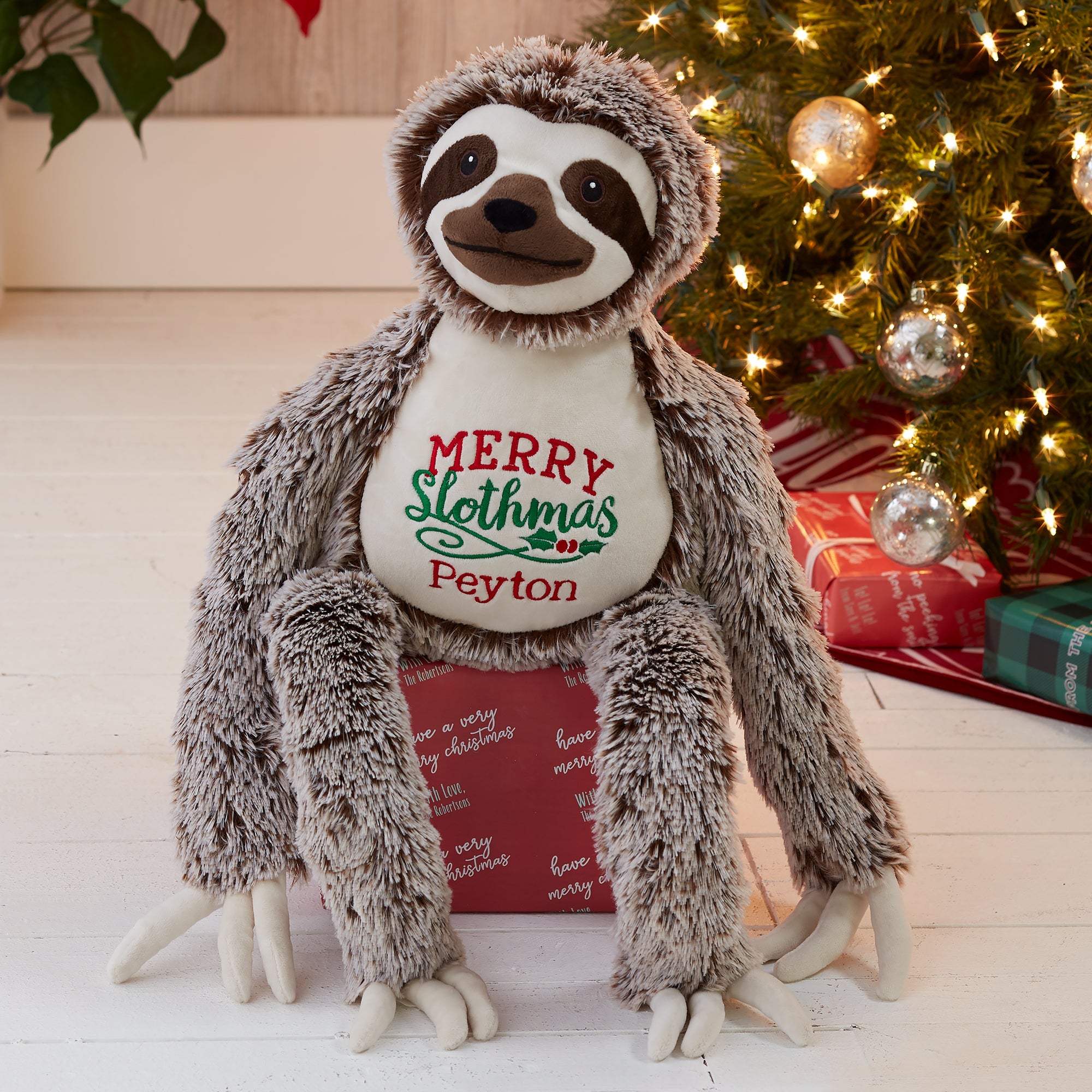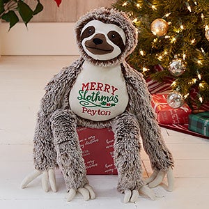The Merry Slothmas Personalized Long Legged Sloth Stuffed Animal is perfect for lazy, winter snuggles. Featuring the embroidered greeting, "Merry Slothmas", this sloth buddy makes for a great Christmas gift!