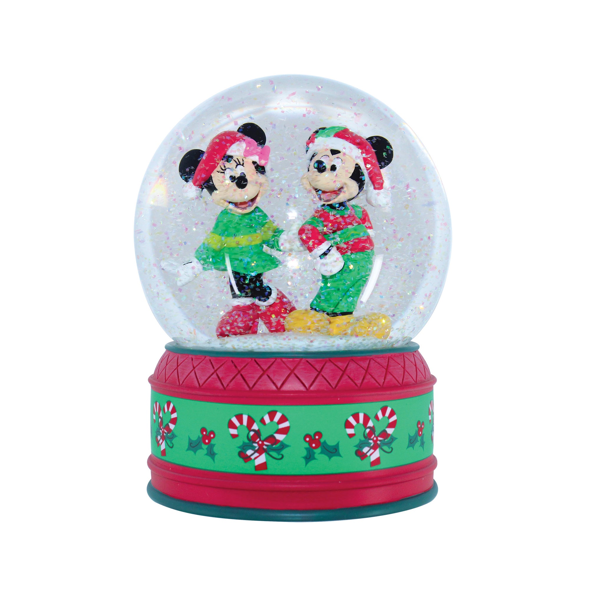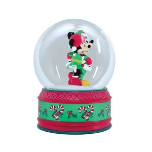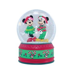 "Mickey and Minnie Mouse are all dressed up in traditional red and green Christmas colors as they venture arm in arm in a winter wonderland of snow. Give a shake and make this magical winter scene come to life."