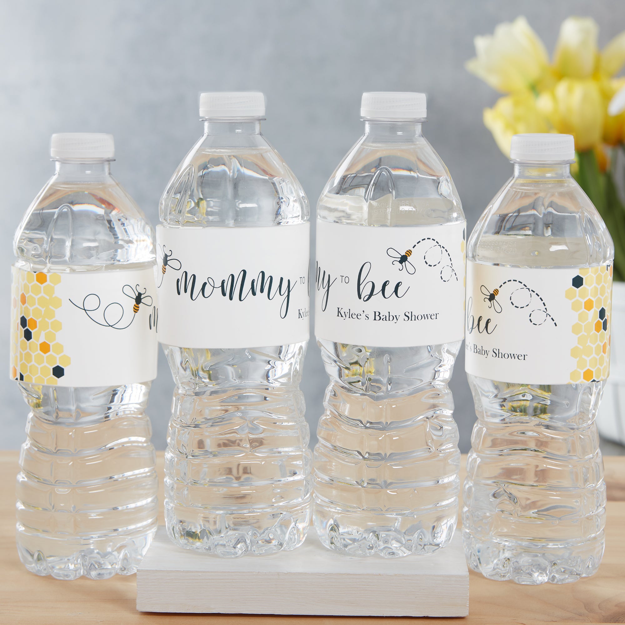 Our Mommy To Bee Personalized Water Bottle Labels are the perfect addition to any bee-themed baby shower.