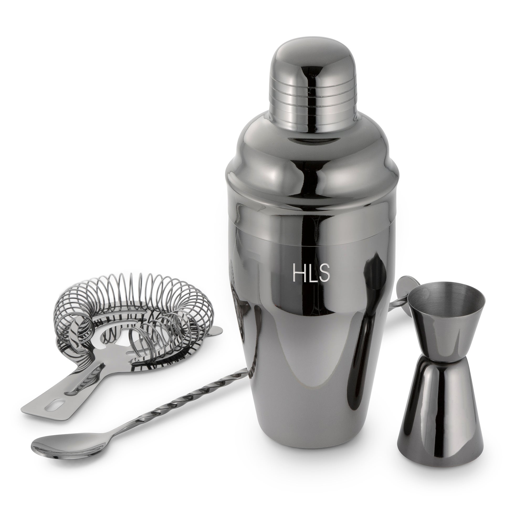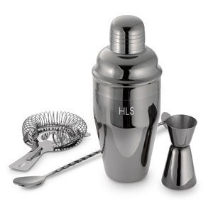 Our Engraved Gunmetal Shaker Set is all they'll need to put the finishing touches on their favorite drink! This set comes with a shaker, strainer, bar spoon, and a double-sided jigger. They will love their monogram engraved on the shaker.