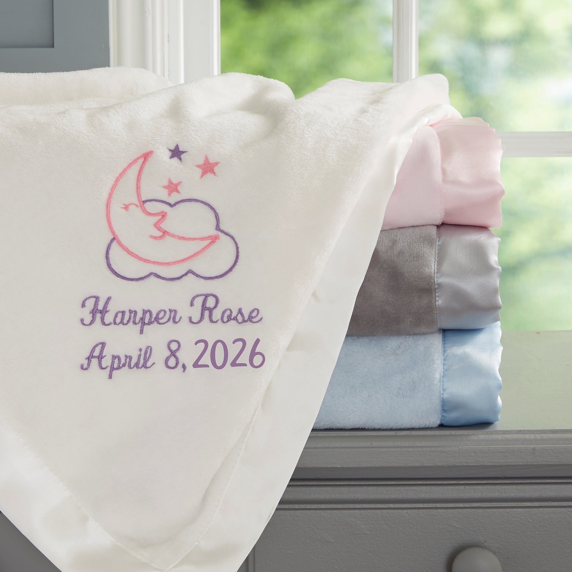 Super soft and with a tailored finish, our satin-trimmed Moon & Stars Personalized Baby Girl Blanket boasts the softest feel for your baby's most snuggly outing.