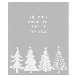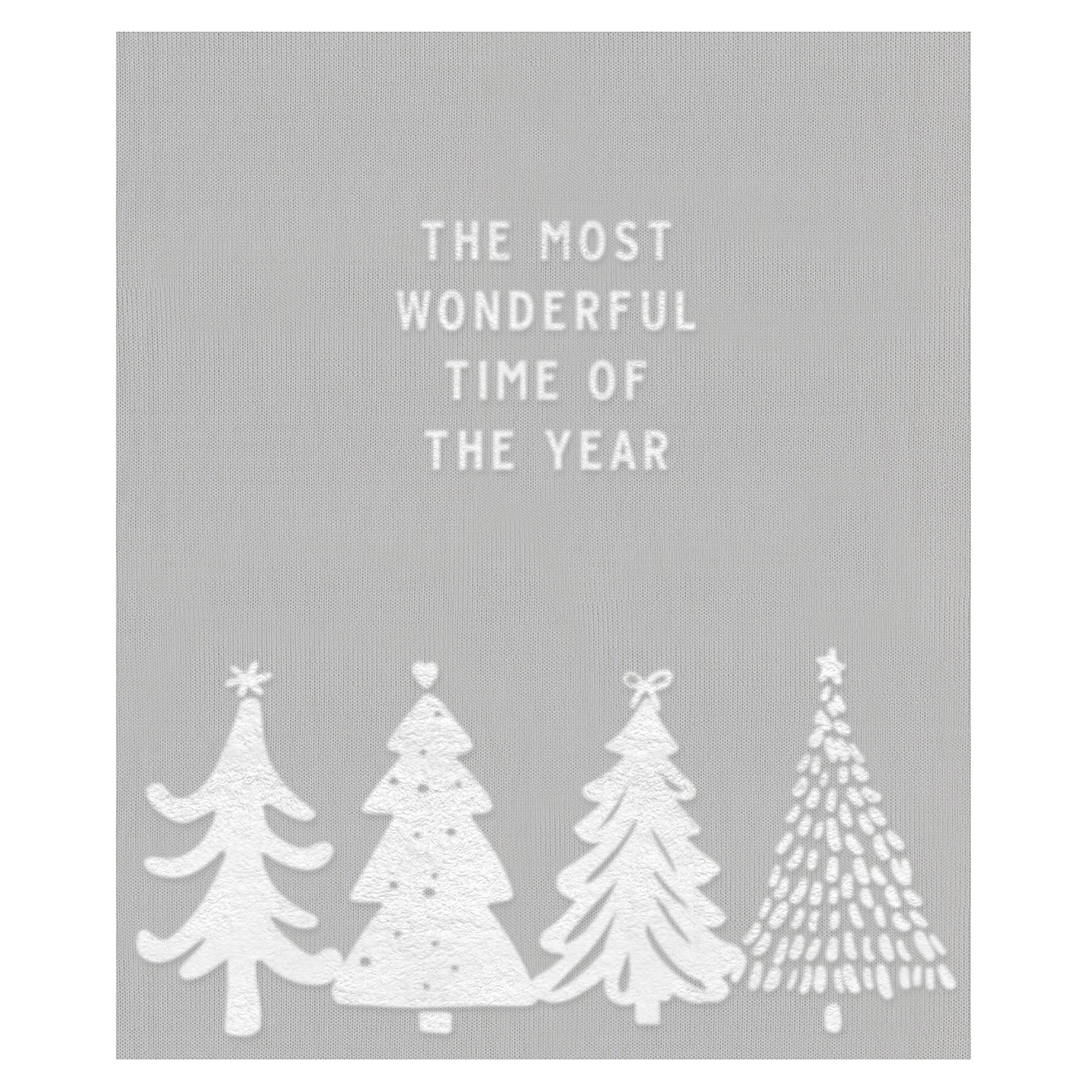 - Grey and white knit throw that has "The most wonderful time of the year" knit above festive evergreen trees