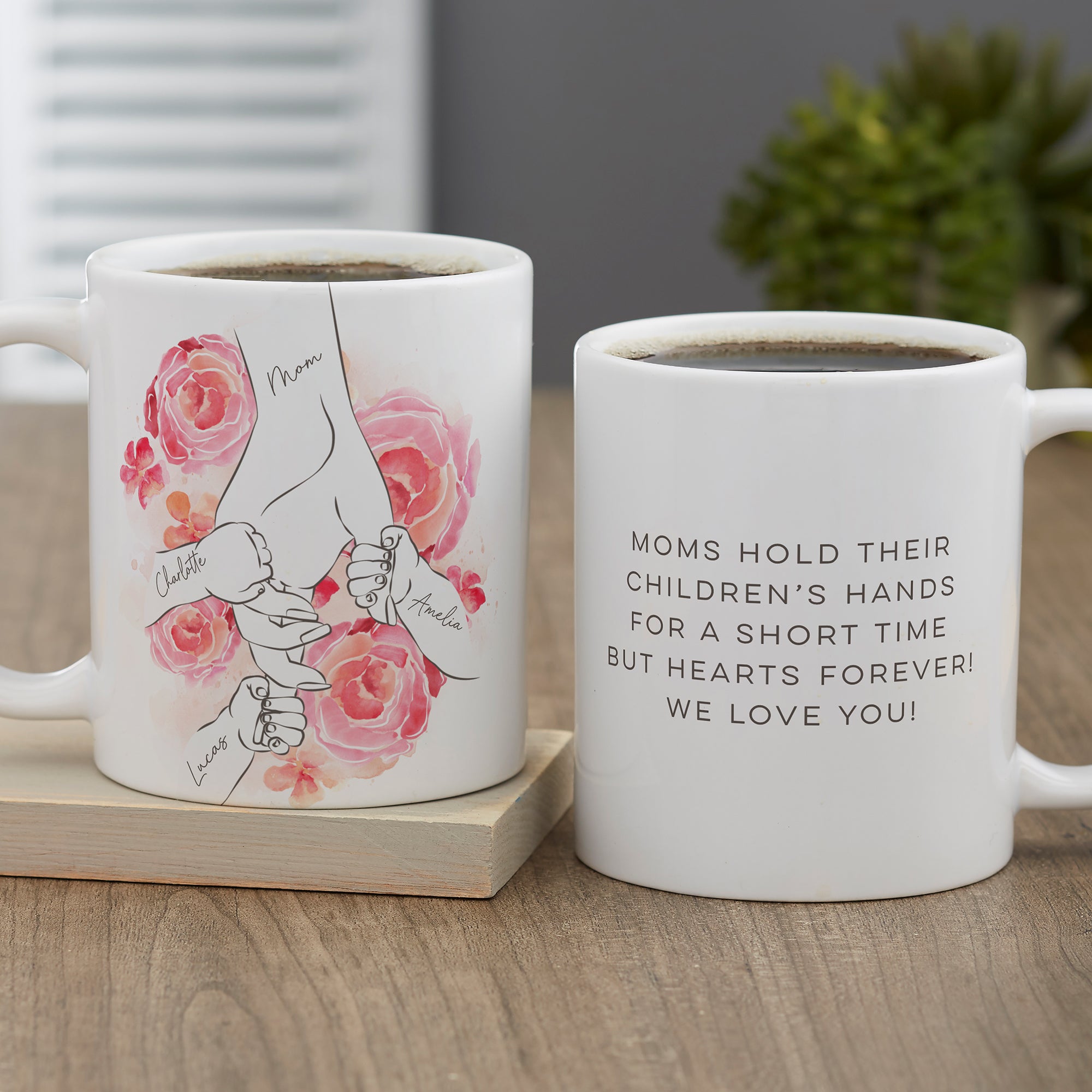 Her heart will be full when she drinks from our Mother's Loving Hand Personalized Coffee Mug designed exclusively for that special lady. A perfect gift for Moms and Grandmas for Mother's Day or any special occasion..