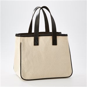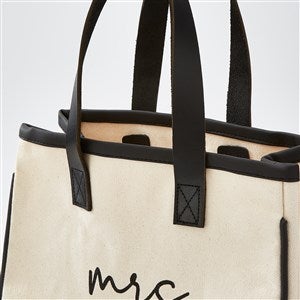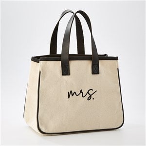 - Canvas tote with genuine leather straps with "mrs." printed on one side