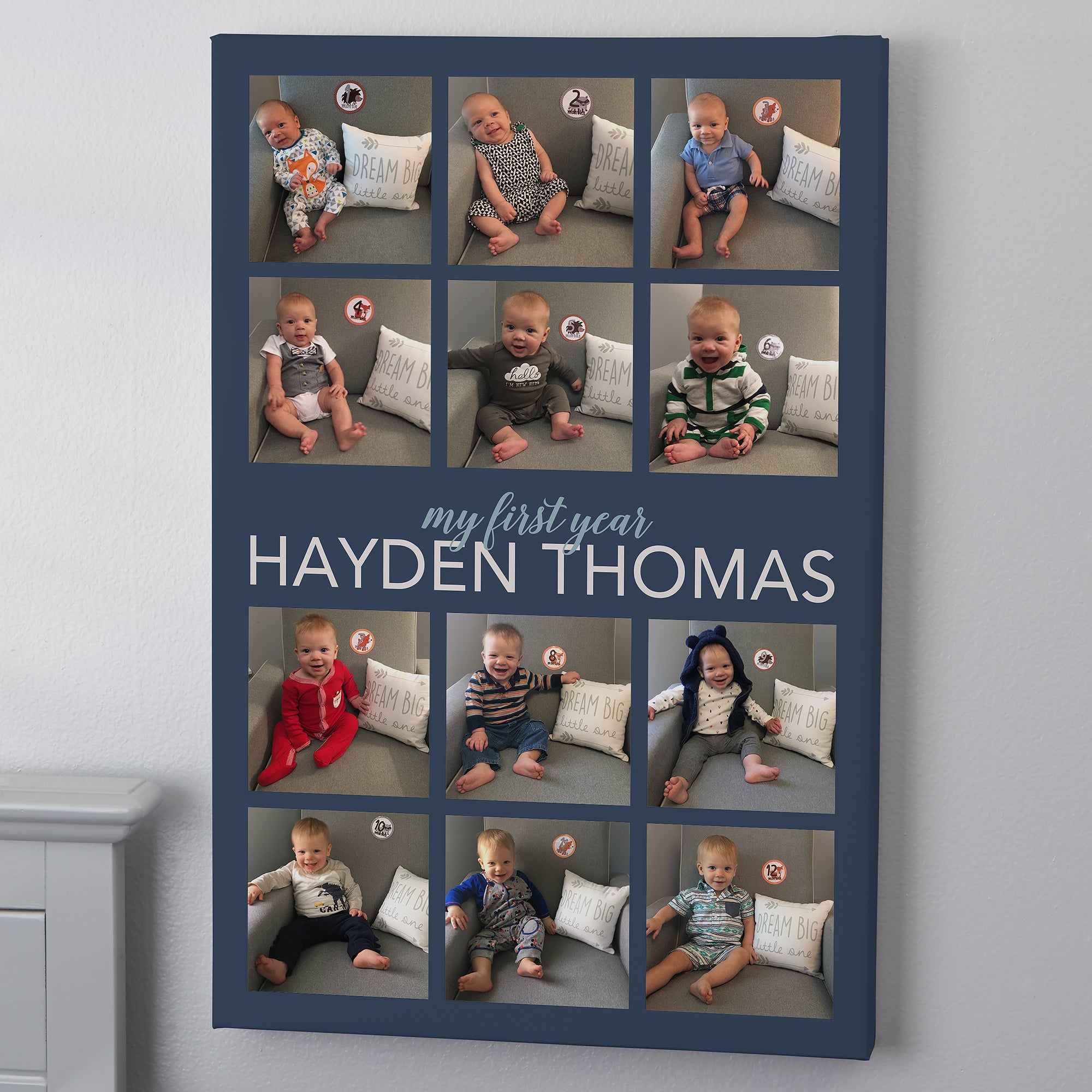 - Upload 12 photos and create a piece of wall art that represents their growth in year one