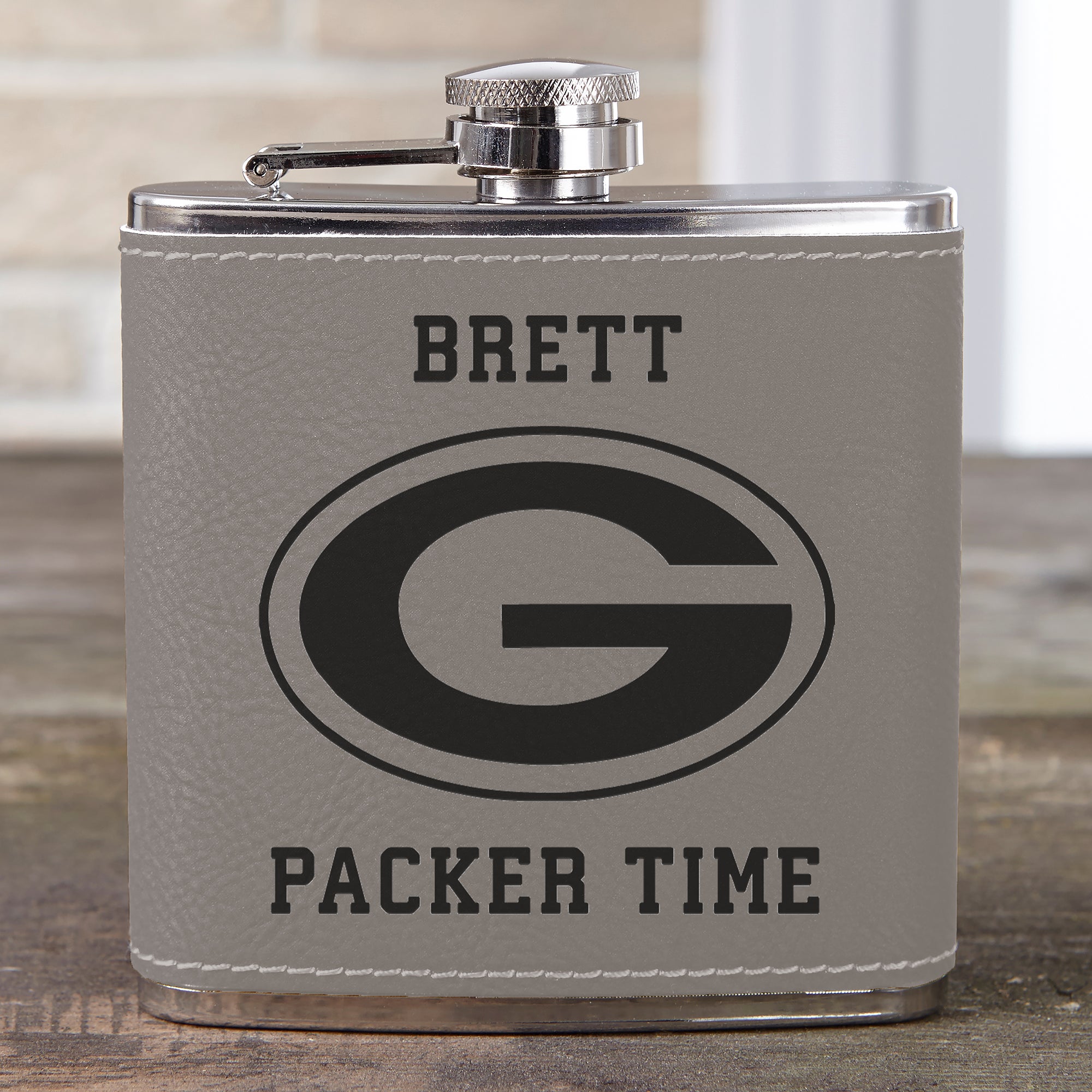 Enjoy your favorite beverage with the NFL Green Bay Packers Leatherette Personalized Flask. Encased in a rich, grey leatherette sleeve, our stainless steel flask fits perfectly in a gentleman's trousers, jacket pocket, carrying case and more.
