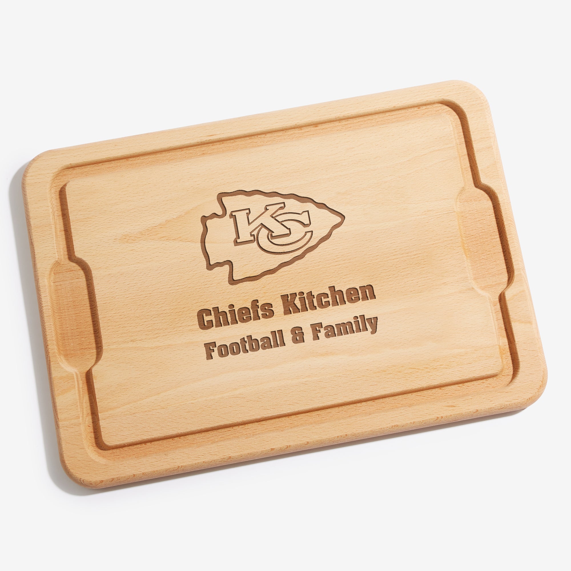 The NFL Kansas City Chiefs Personalized Hardwood Cutting Board is a must have kitchen accent for any football fan!