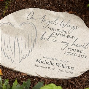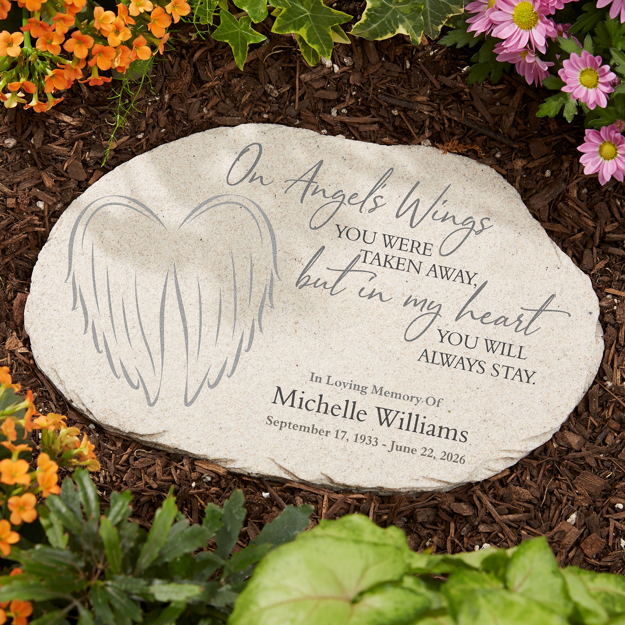 Remember a lost loved one with our On Angels Wings Personalized Round Garden Stone. This stone sits flat in a flower bed, garden or walkway, creating a special memorial.
