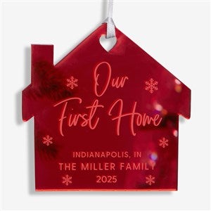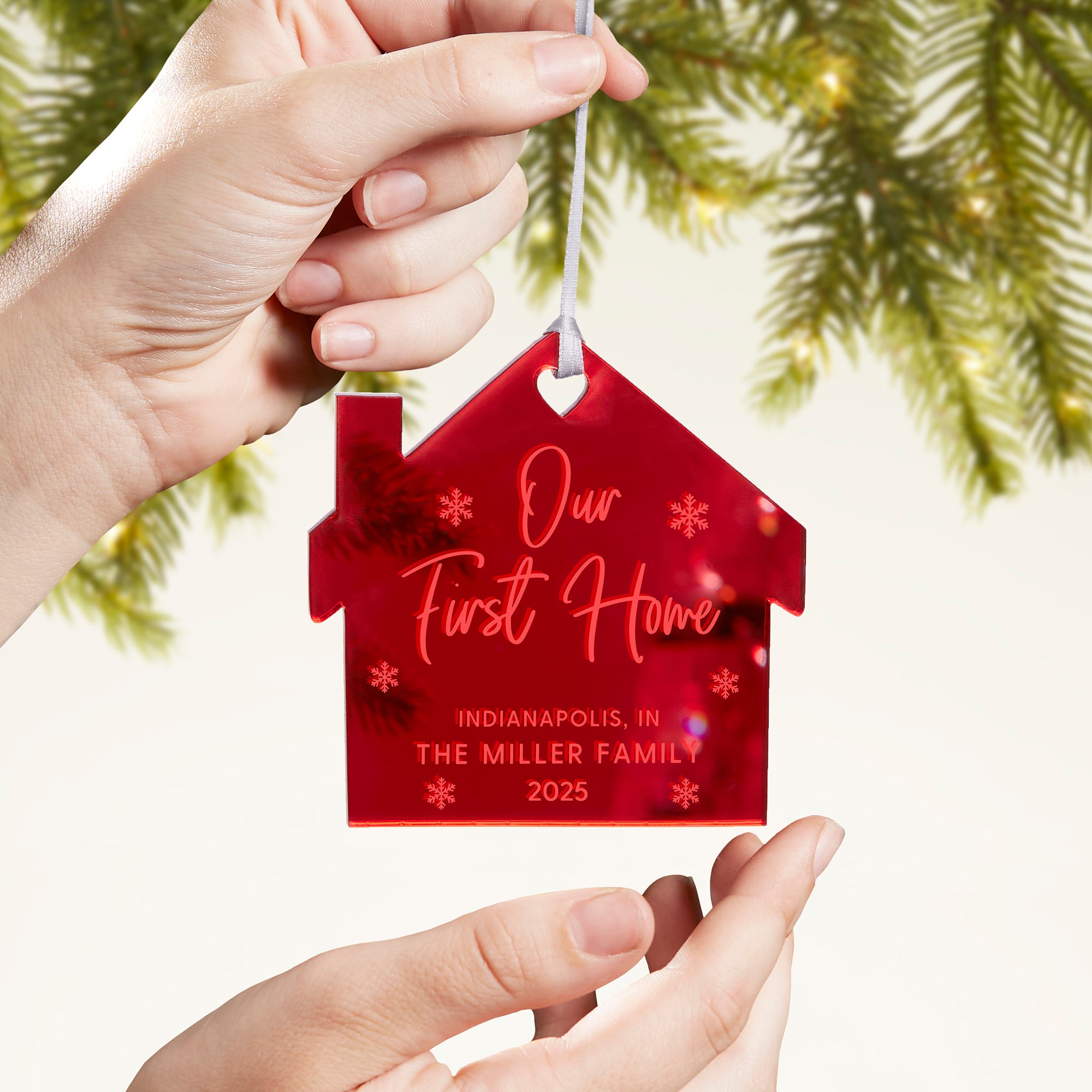 Choose our Our First Home Personalized Acrylic Ornament for any new home buyer on your list. The house is cutout of a mirrored acrylic creating a beautiful reflection to hang on any holiday tree.
