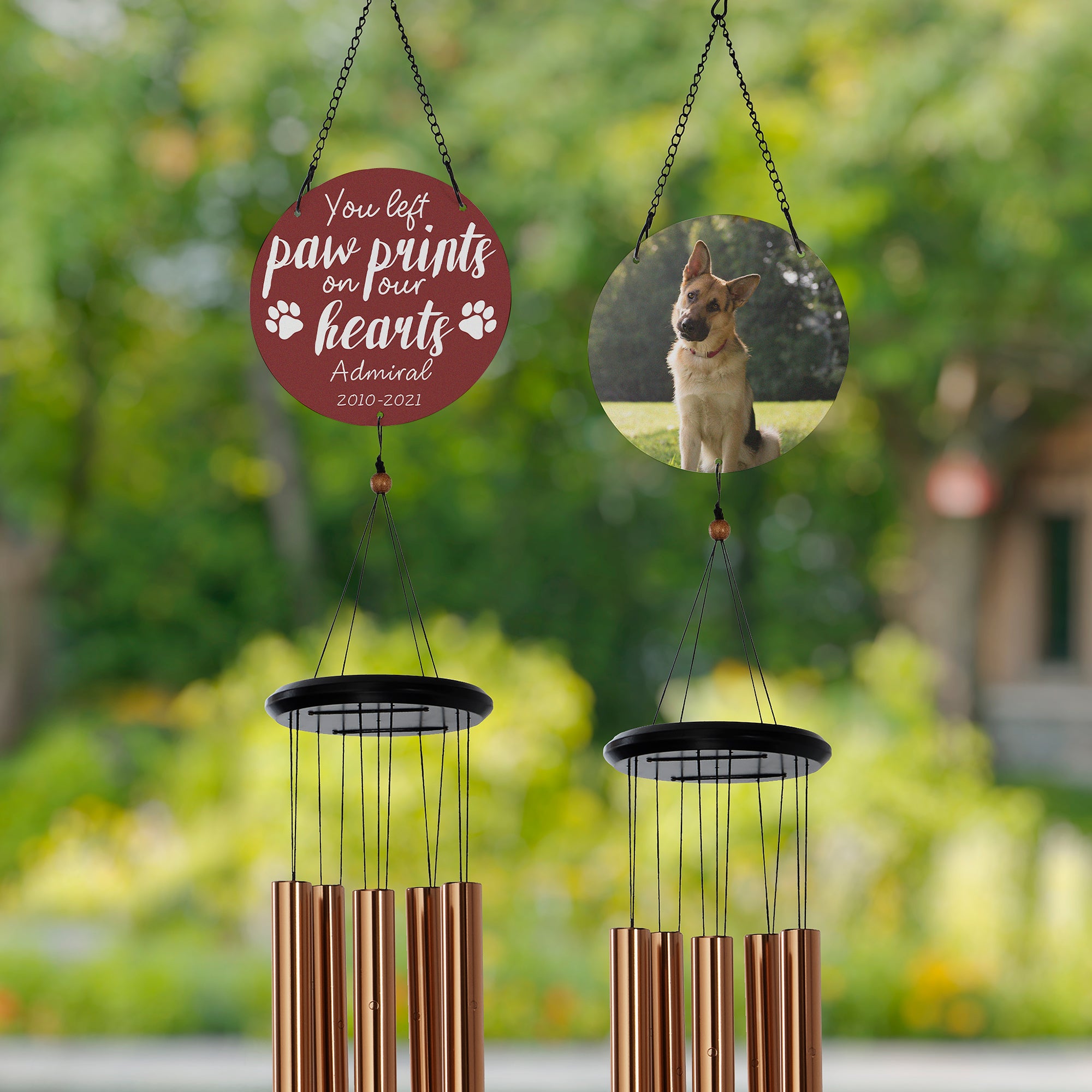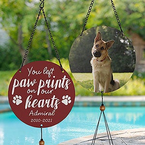 Remember your beloved pet whenever the wind blows with our Paw Prints On My Heart Personalized Memorial Photo Wind Chimes. These chimes feature your choice of memorial phrase and any pet photo, creating a special keepsake.