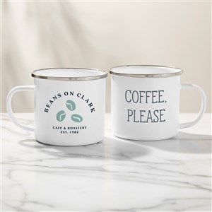 Our large Personal Logo Enamel Mug 18 oz can be customized with any name, logo, and/or text. Features a silver rimmed edge.