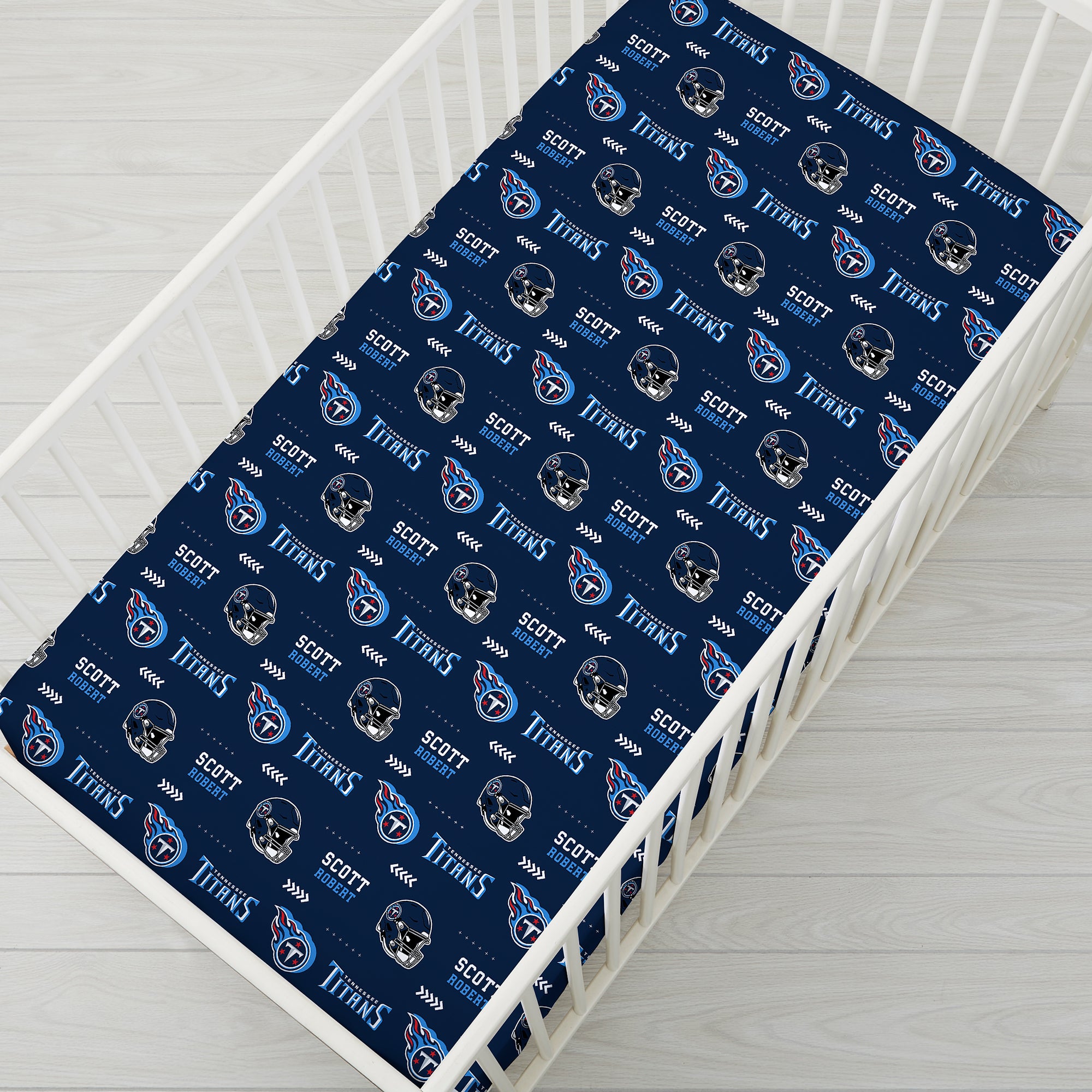 The NFL Tennessee Titans Crib Sheet adds baby's name to your favorite team logo and makes a truly personal nursery design. This crib sheet makes a great gift for a newborn baby boy or girl!