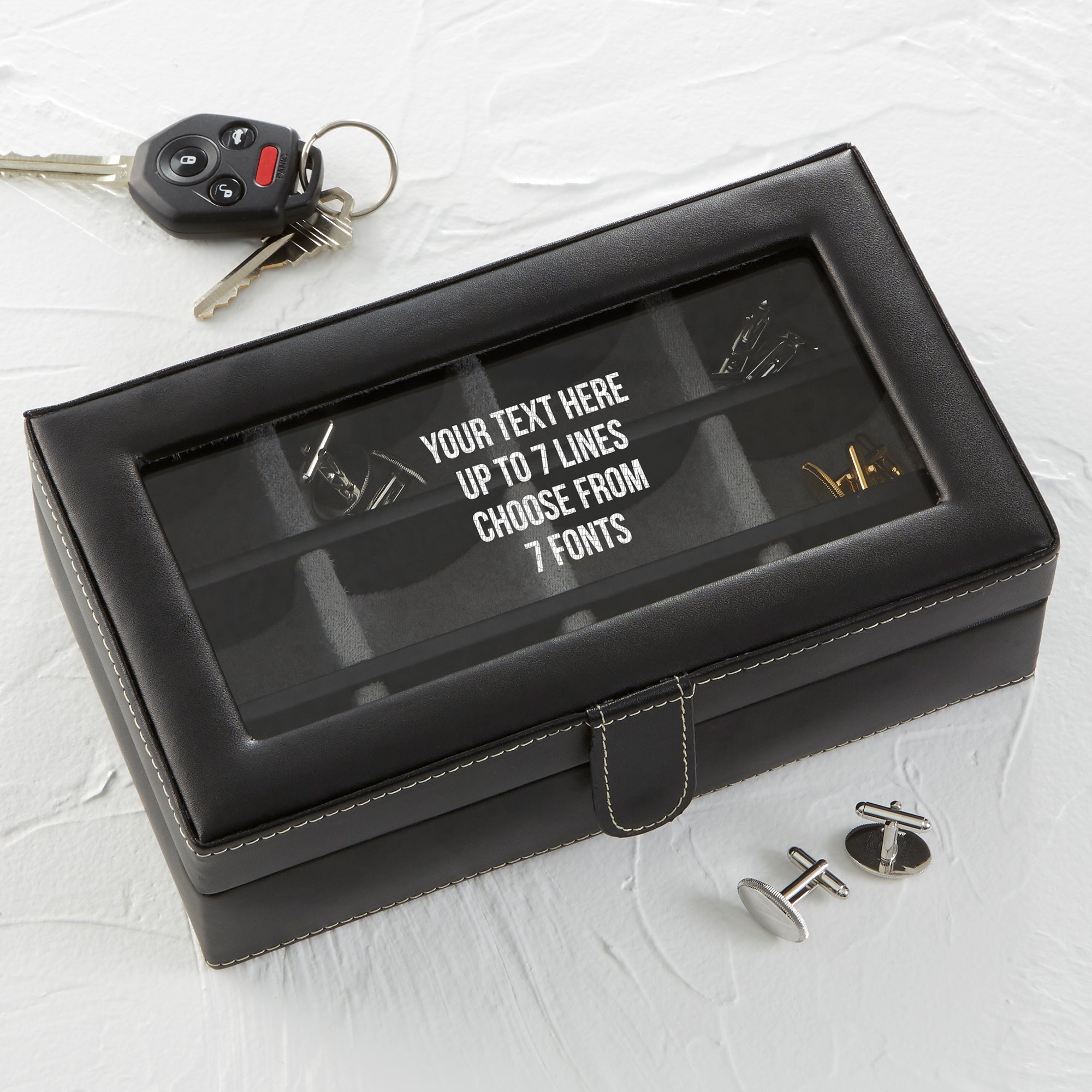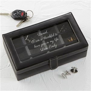 Our Engraved Message Leather 12 Slot Accessory Box  is a handsome way to store and protect his valuable cuff links. Featuring 12 storage compartments, this box makes a special gift for him to to store his accessories.