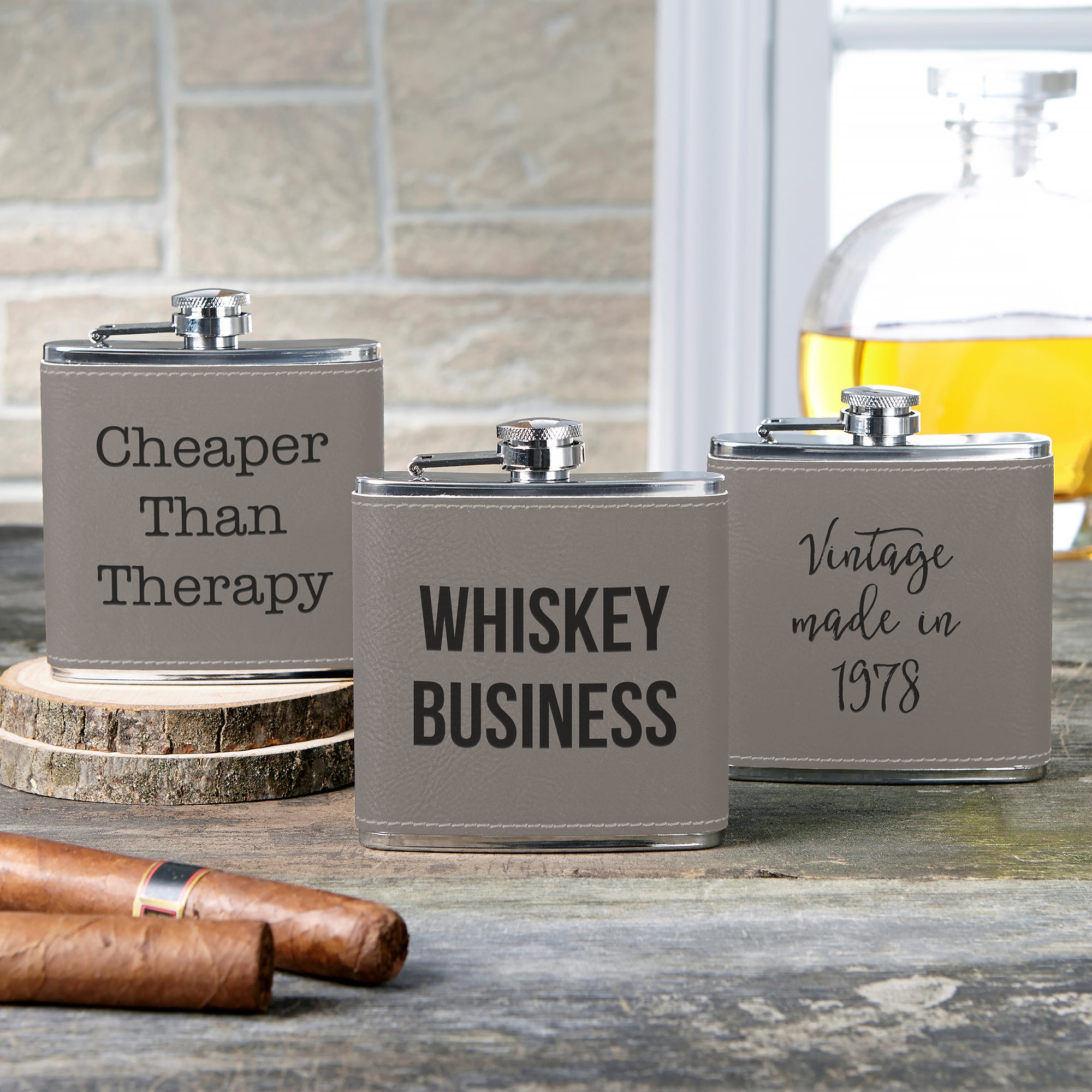 The Expressions Leatherette 6 oz. Personalized Flask gives a unique and witty addition to your fun filled event. Custom engraved with any 3 line message, choose font style. Perfect for birthdays, groomsmen, bridesmaids and much more!