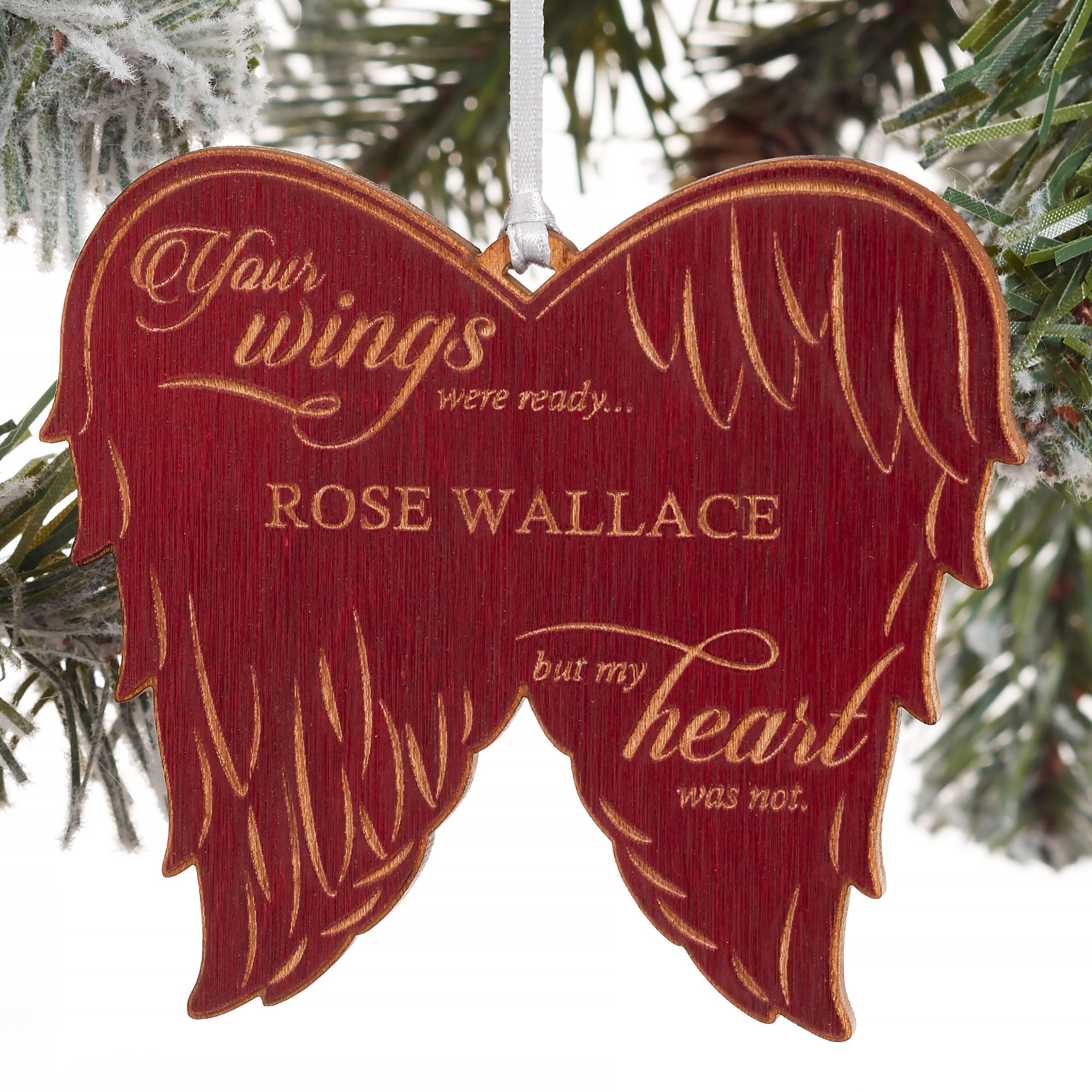 Keep their memory alive during the holidays with our exclusive Memorial Angel Wings Personalized Wood Ornament.