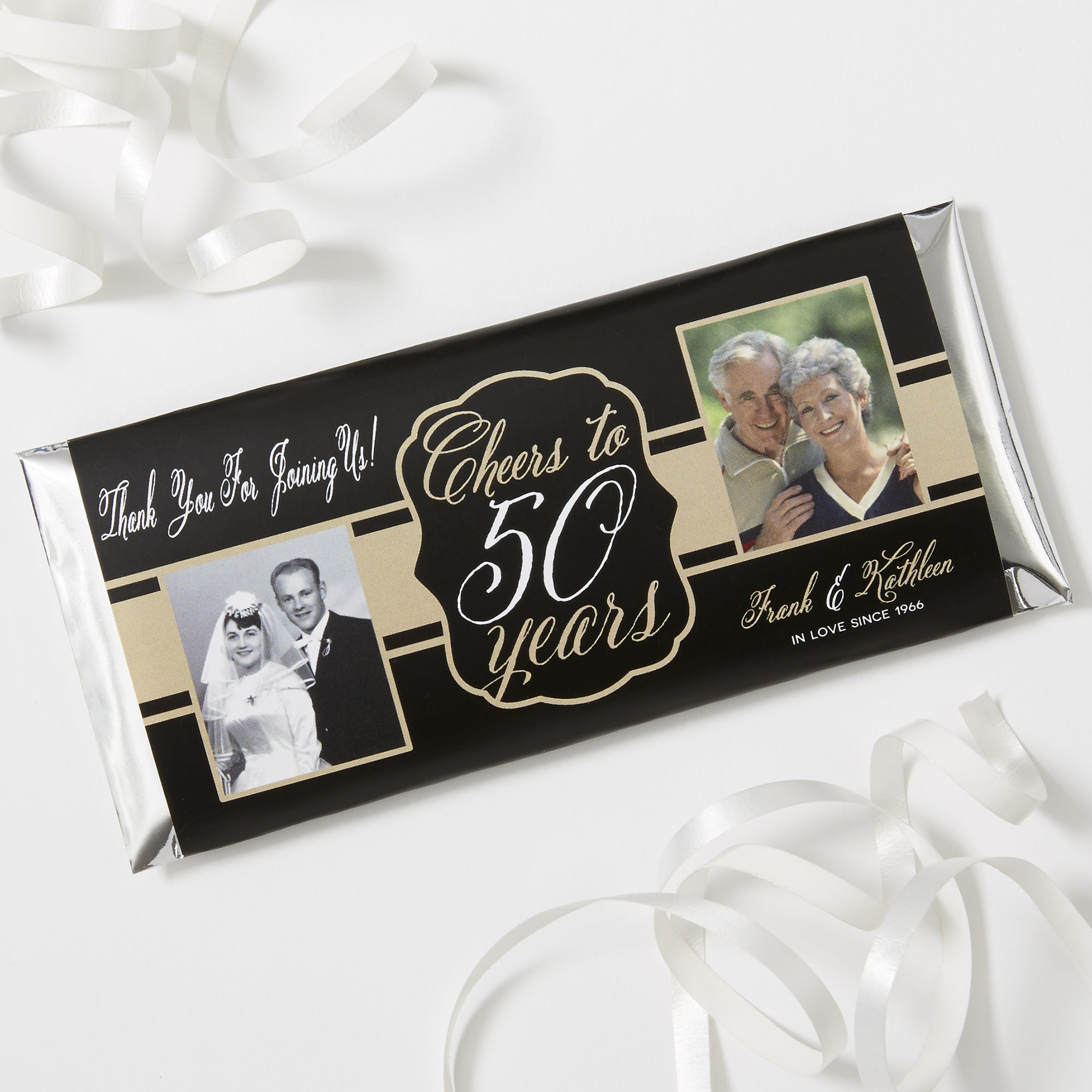 Thank your guests for celebrating your special anniversary with our Cheers To Then & Now Personalized Candy Bar Wrappers. Our personalized chocolate bar wrappers are beautifully detailed and come with foil pouches to fit any regular size chocolate bar! Quick and easy to assemble – just slide candy bar into silver foil pouch. The candy bar will fit into the silver foil pouch with original wrapper still on!