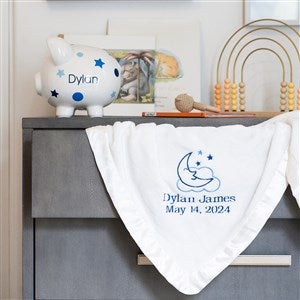 Super soft and with a tailored finish, our satin-trimmed Moon & Stars Personalized Boy Baby Blanket boasts the softest feel for your baby's most snuggly outing.