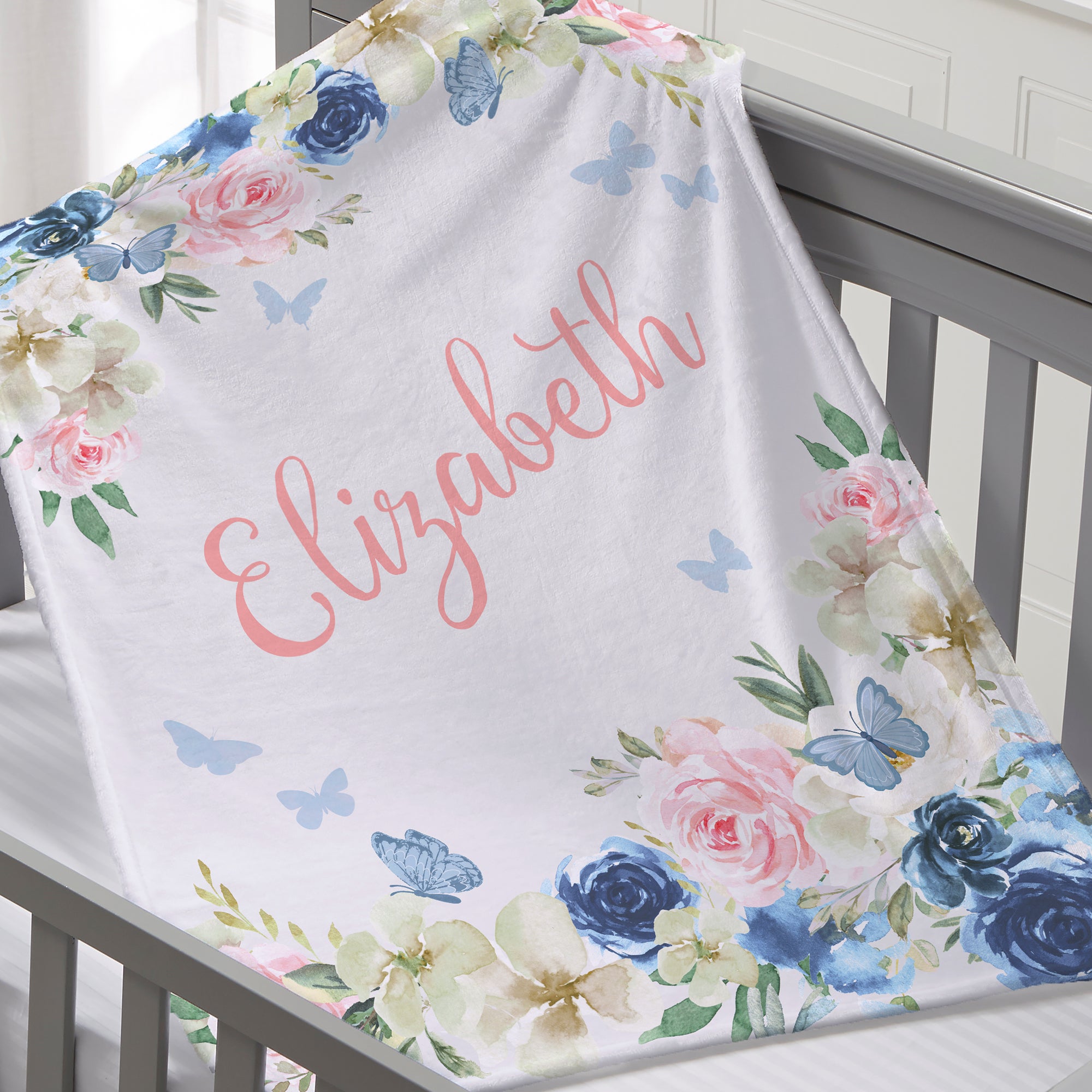 The Butterfly Kisses Baby Girl Personalized Blanket is sure to keep baby warm and makes for a special keepsake for both parents and baby. The beautiful floral and butterfly design is sure to match or accent any nursery.