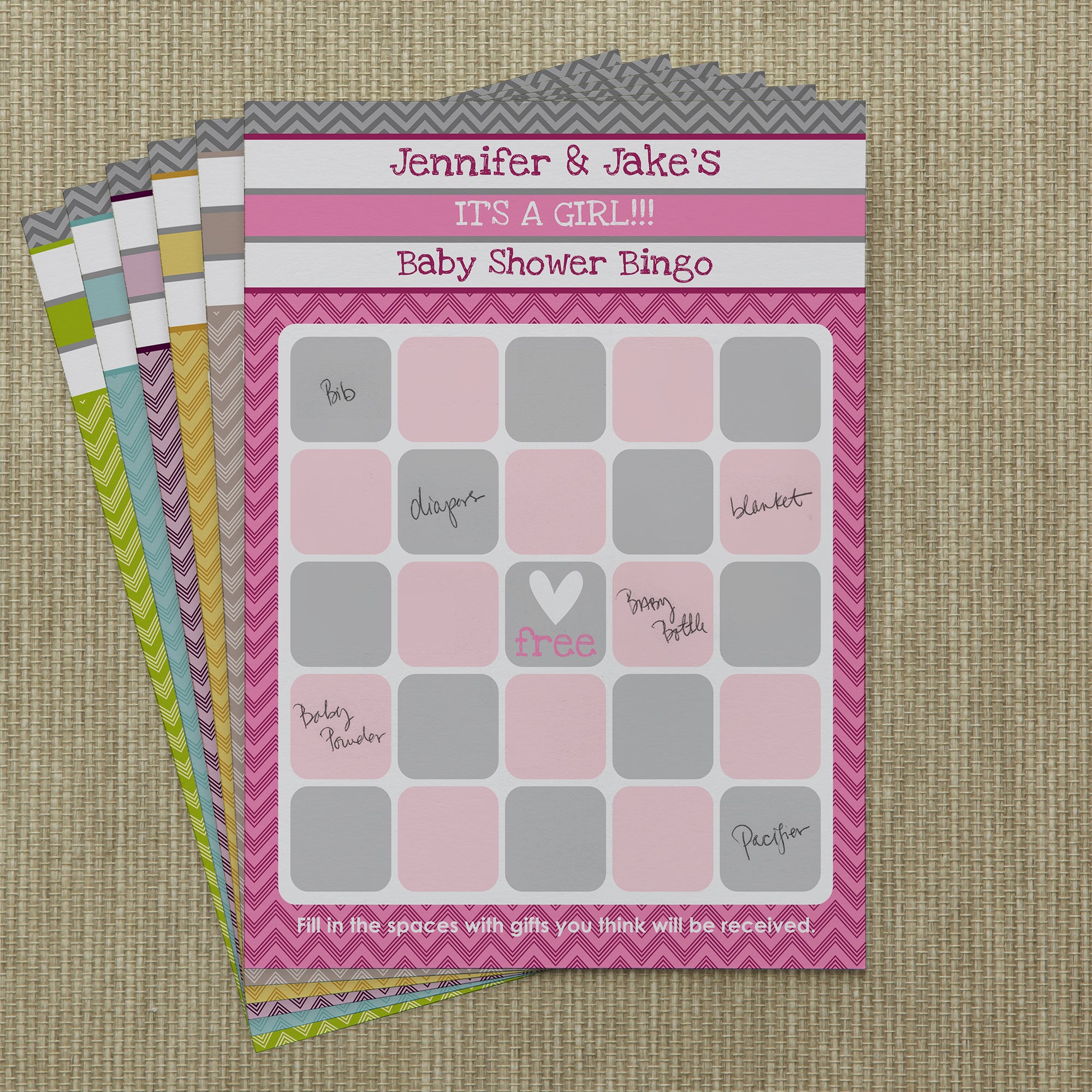 Choose from 6 color options and custom personalize the top of each Bingo card with any 3 lines of personalization to celebrate the mom-to-be and her coming bundle of joy!